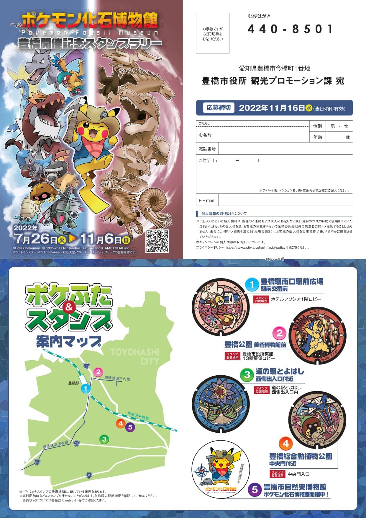 | 場所 | 市内4ヶ所に設置されたマンホールおよび豊橋市自然史博物館 特別企画展「ポケモン化石博物館」会場内 |