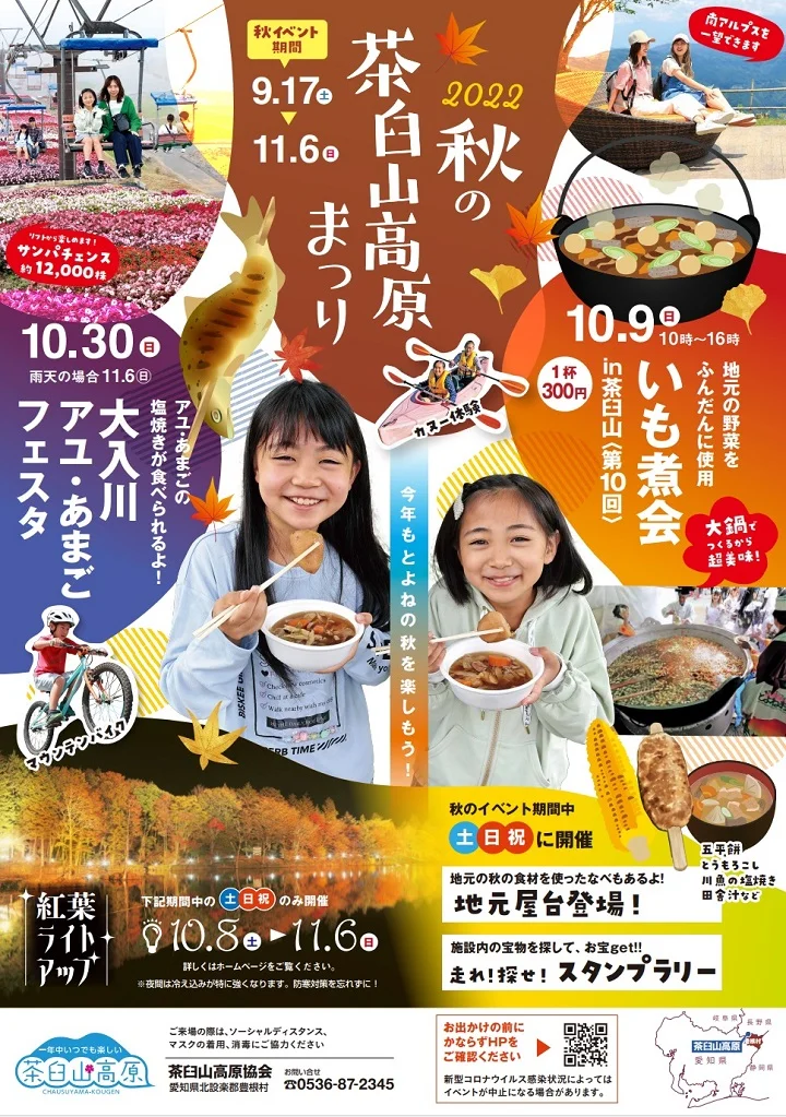 「いも煮会」をはじめ、露店販売など豊かな自然の中でおもいっきり楽しめるイベントを茶臼山で行います。また、紅葉は10月下旬から11月上旬で愛知県で一番早く紅葉が始まります。