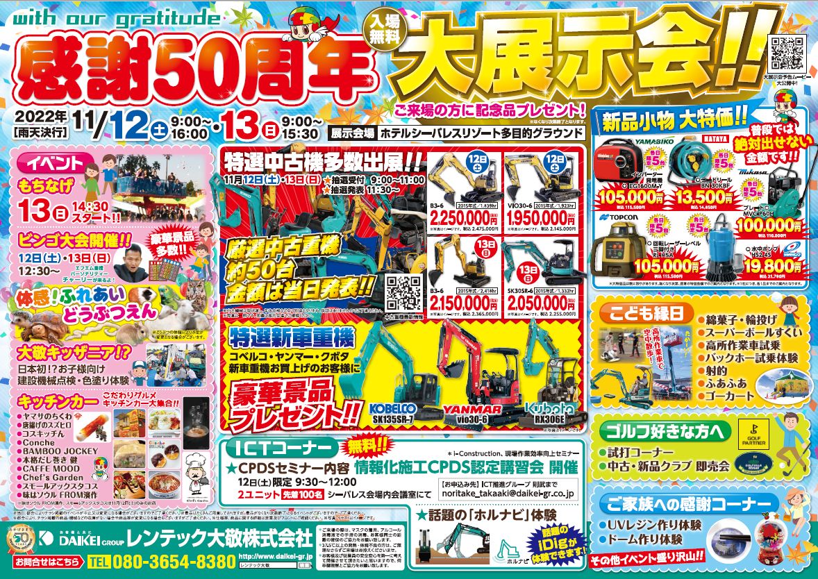 11/12(土)、11/13(日)豊橋市の「ホテルシーパレスリゾート」内多目的グラウンドにて、大敬グループ創業50周年を記念した、大展示会が開催されます!