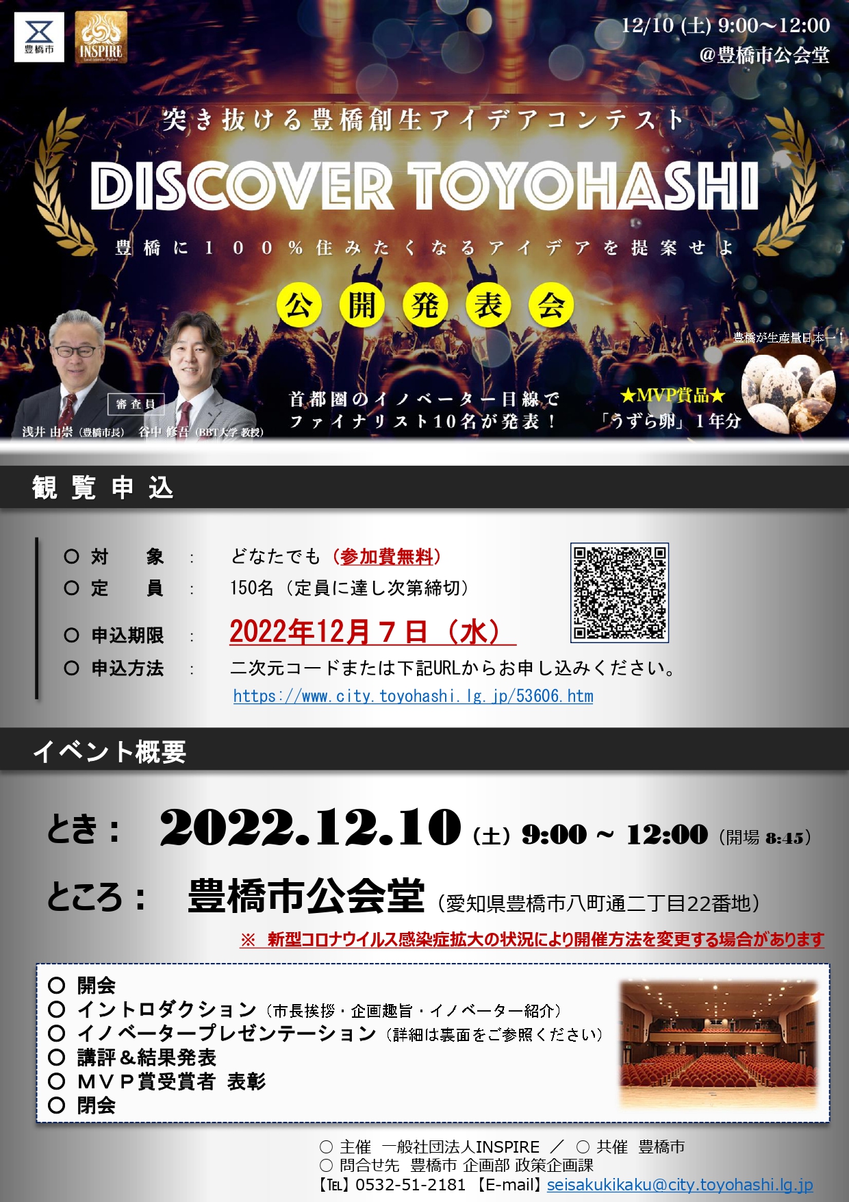 そこで、国内最大級の地方創生イノベータープラットフォーム「INSPIRE(インスパイア)」を運営する一般社団法人 INSPIRE との共催により、突き抜ける豊橋創生アイデアコンテスト「Discover Toyohashi(ディスカバー豊橋)」を初めて開催します。