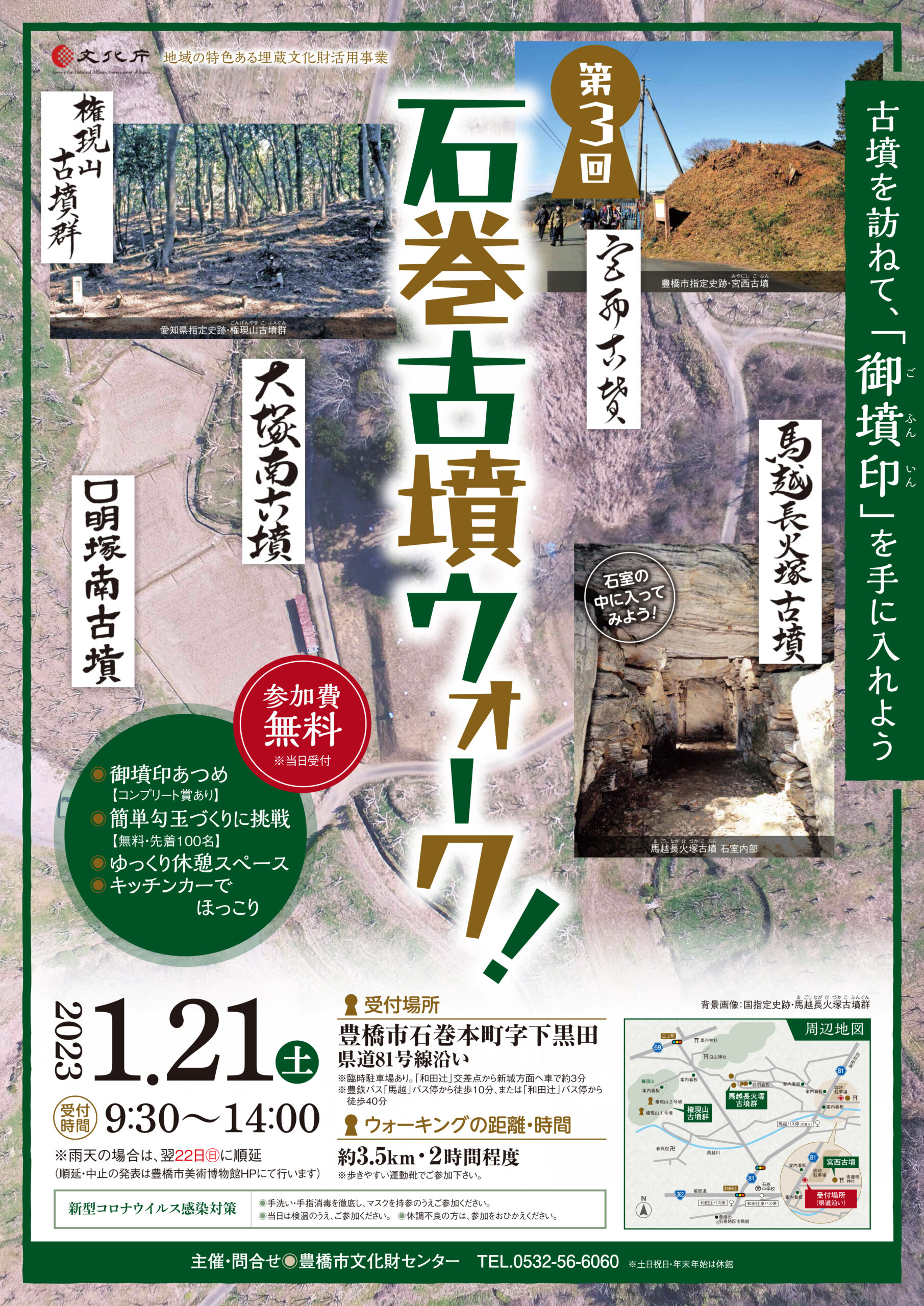 今年度も、石巻古墳ウォーク!を開催します。3か所の古墳をめぐり5枚の「御墳印」を手に入れましょう。簡単勾玉づくり(先着100名)や、キッチンカーも来場。冬の寒さを古墳めぐりでふき飛ばそう!