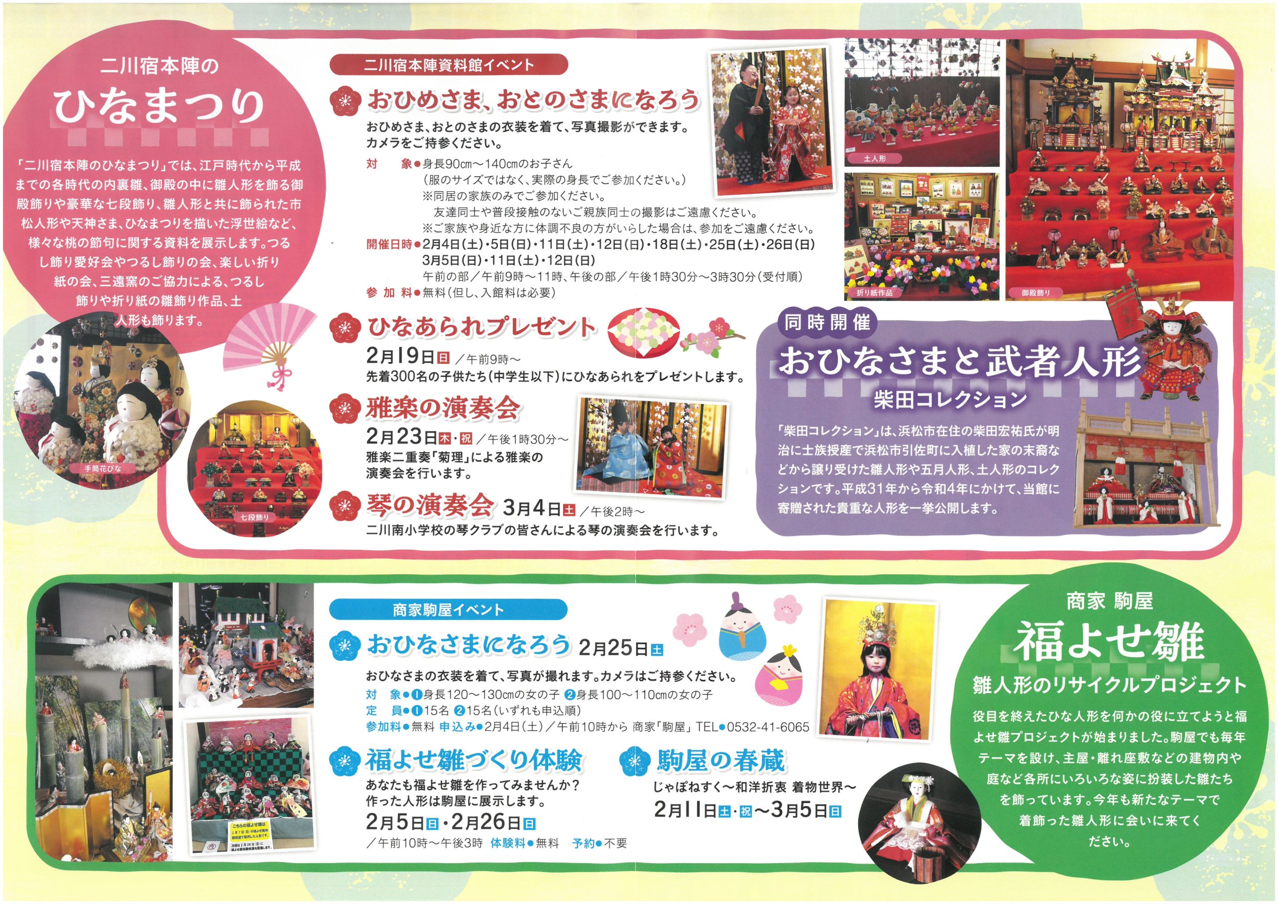 | 商家駒屋イベント | 〇おひなさまになろう 2月25日(土) 対象:①身長120~130cmの女の子 ②身長100~110cmの女の子 ※要申込み 〇福よせ雛づくり体験 〇駒屋の春蔵 |