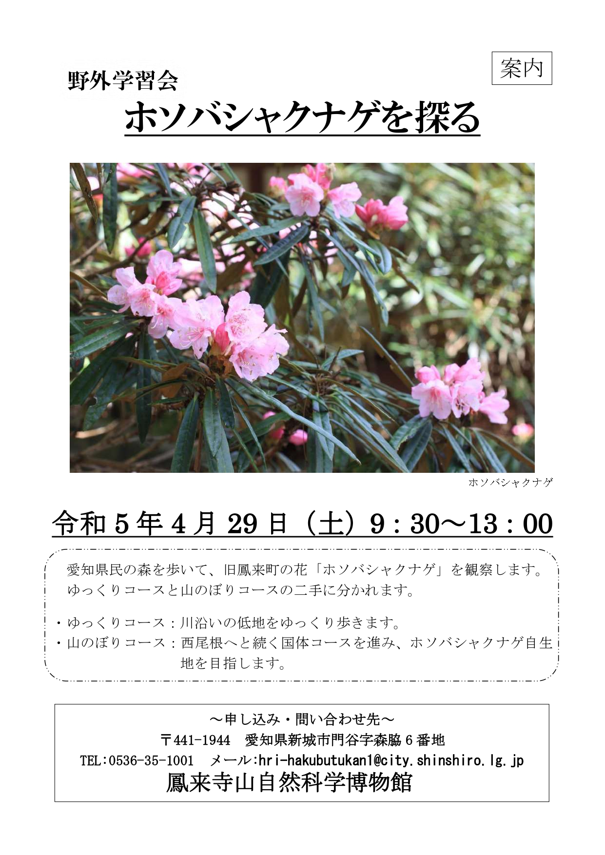 | お問い合わせ | 新城市 教育部 生涯共育課 鳳来寺山自然科学博物館 TEL:0536-35-1001 FAX:0536-35-5012 |