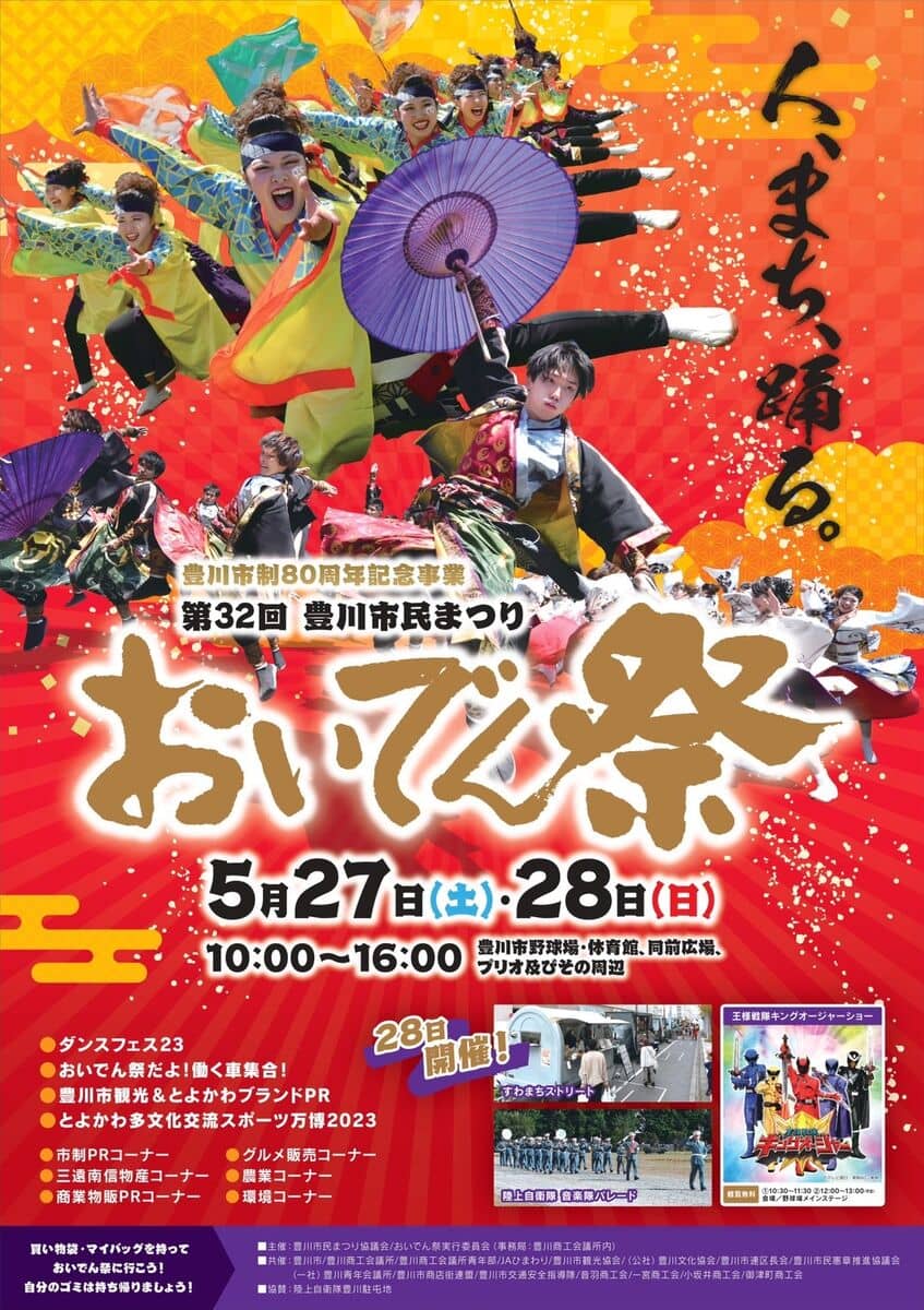 2023年5月27日(土)、28日(日)に豊川市野球場において4年ぶりにおいでん祭が開催されます。「ダンスフェス23」等恒例ダンスのイベント、商業・グルメコーナー、戦隊ヒーローショー、陸上自衛隊豊川駐屯地の音楽隊による演奏、「おいでん祭だよ!働く車集合!」など2日間、多彩なイベントを繰り広げます。