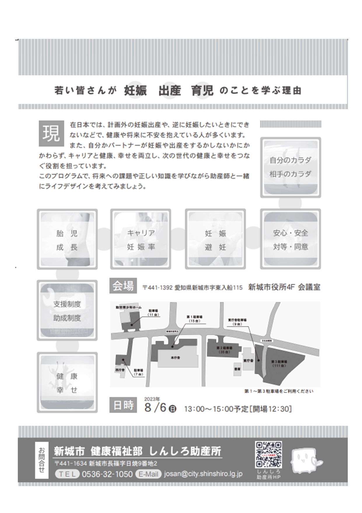 | お問い合わせ | 新城市 健康福祉部 しんしろ助産所 TEL:0536-32-1050 FAX:0536-32-1040 |