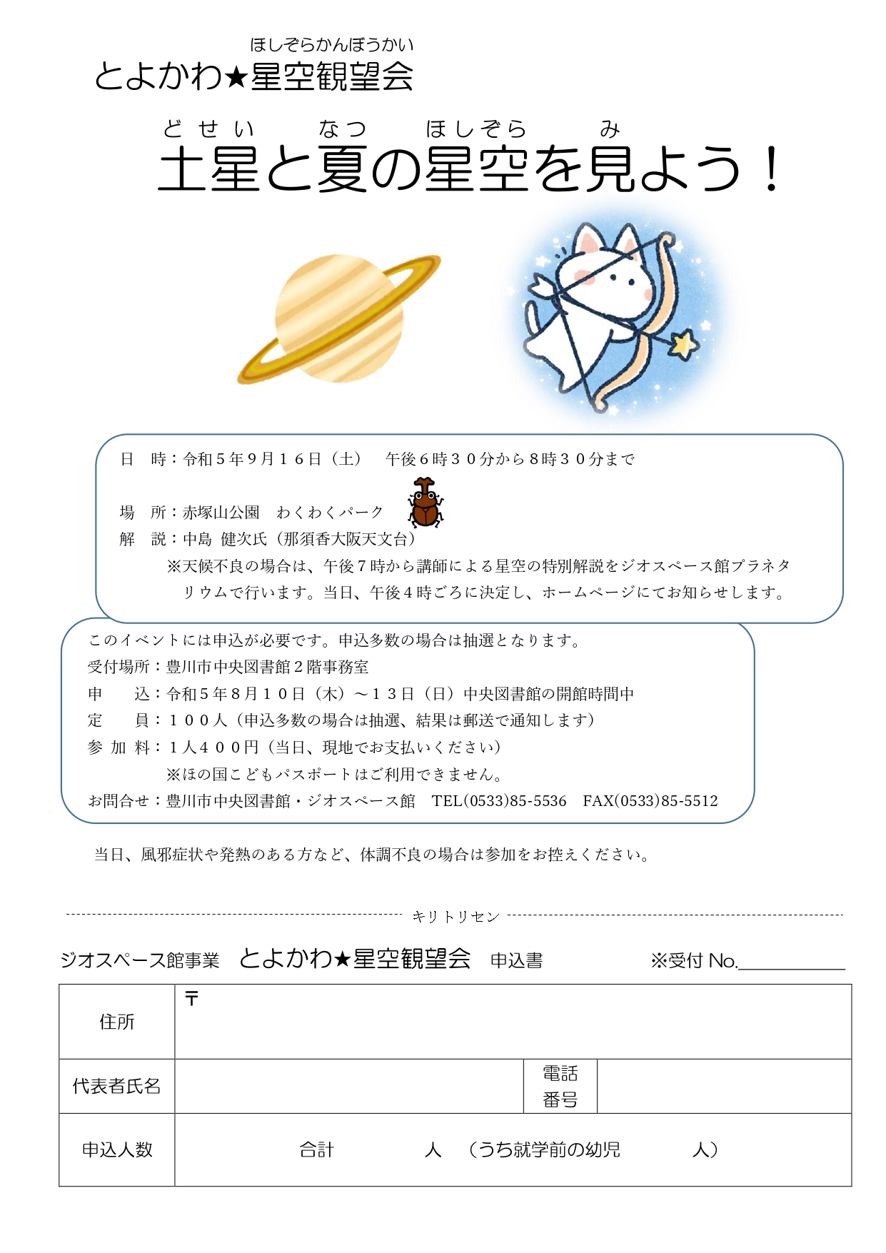 豊川市ジオスぺース館では、次のとおり、とよかわ星空観望会「土星と夏の星空を見よう!」を開催します。
