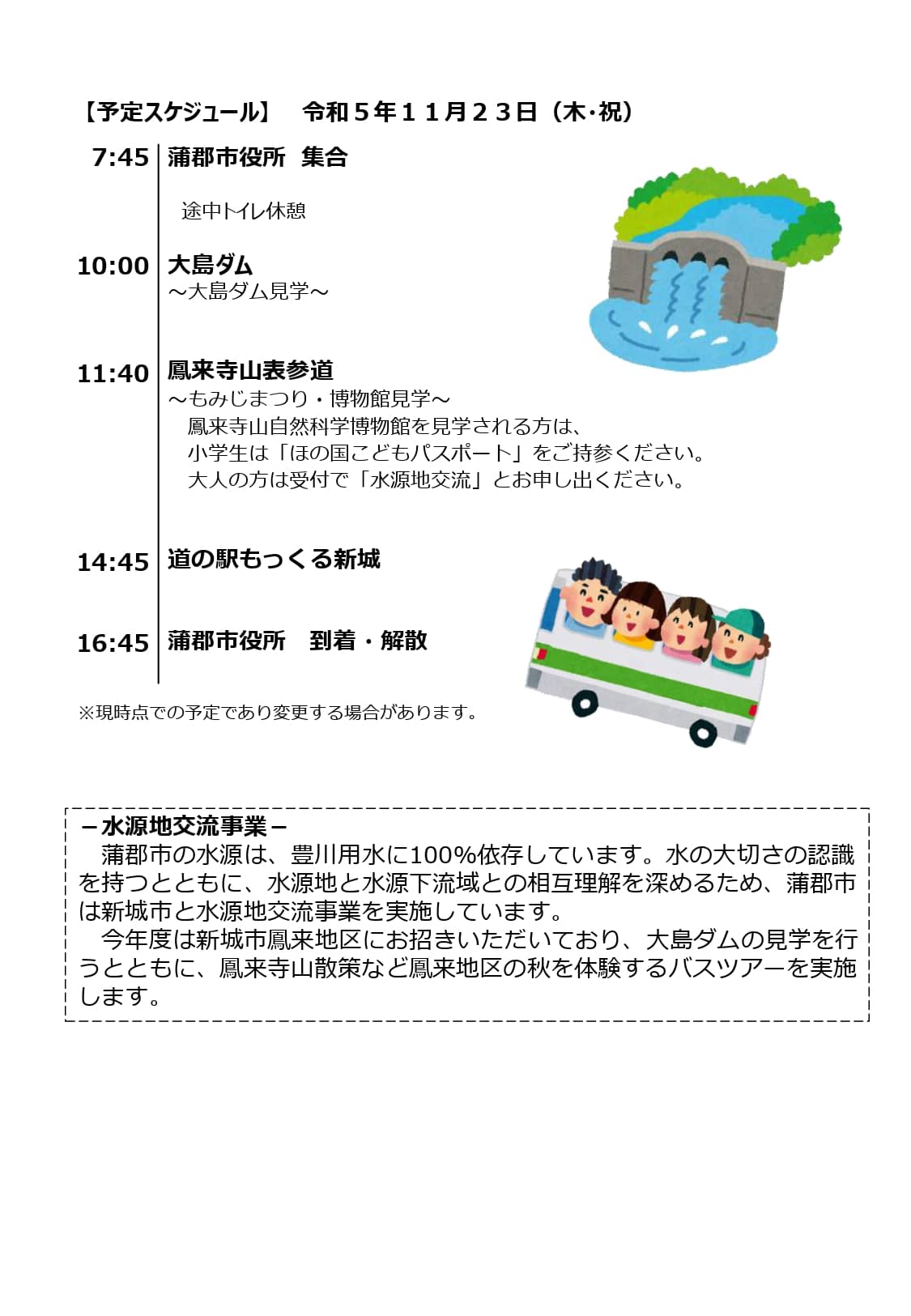 | 場所 | 大島ダム、鳳来寺山表参道、道の駅もっくる ※蒲郡市役所からバスで移動 |