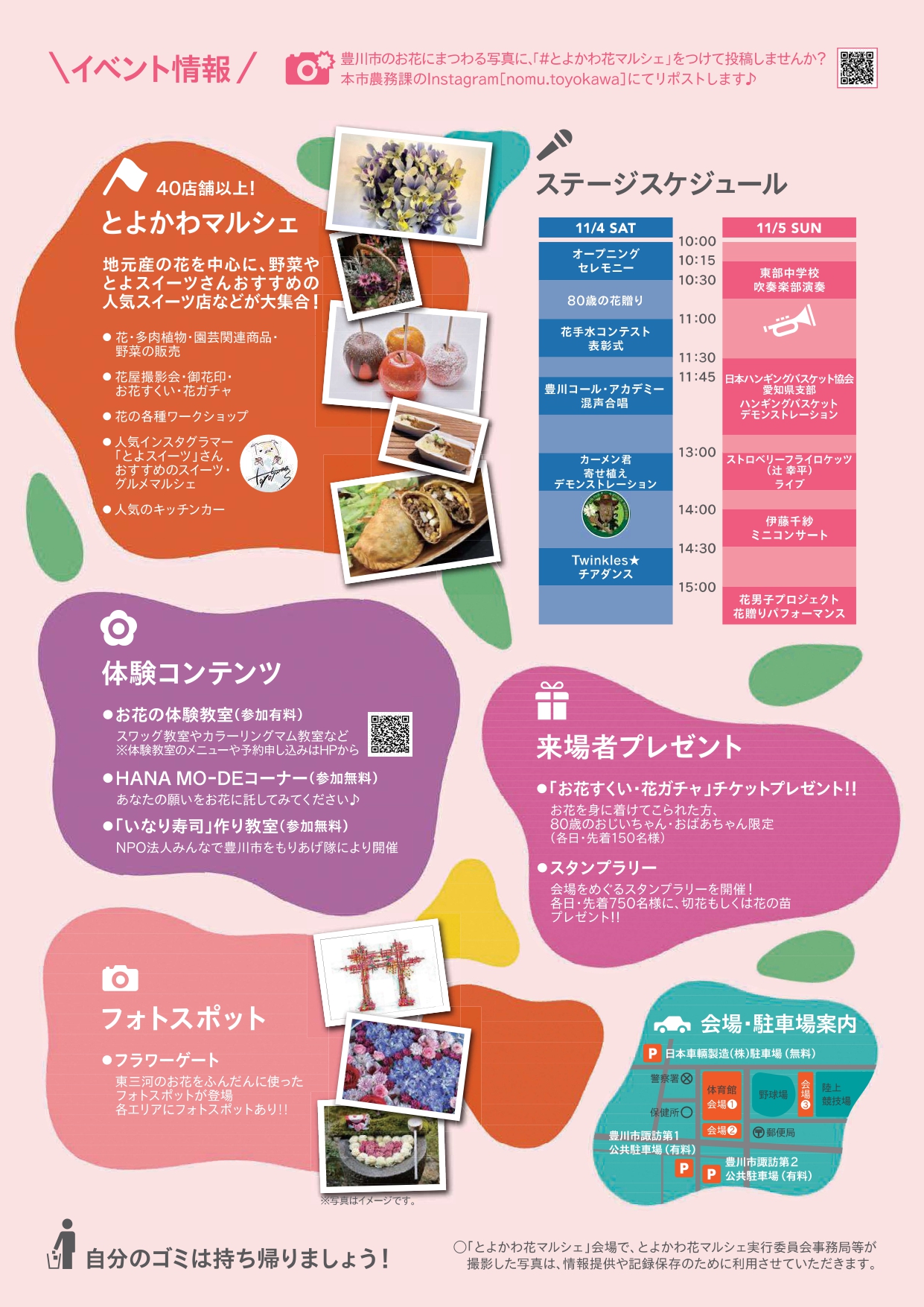 花き販売、農産物販売、花関連の雑貨等販売、花関連のワークショップ、花関連のキッチンカーなど、とよかわフラワープロジェクト、事務局屋外本部(スタンプラリースポット、花の体験講座当日受付、80歳の方及びお花のアイテムを身に着けてくれた方へのプレゼント(お花すくい、花ガチャチケット))
