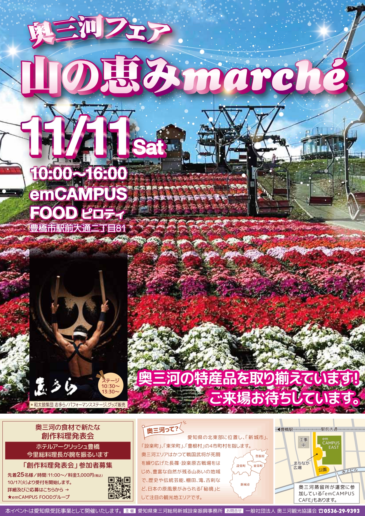 奥三河地域の特産品や体験が集まる「奥三河フェア山の恵みmarché(マルシェ)」がemCAMPUS(エムキャンパス) FOOD(フード) にて開催されます。