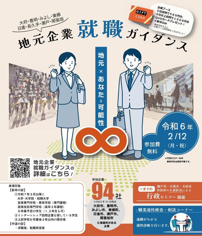 地元企業就職ガイダンスは、就職活動が本格化する前の学生に、業界や業種、企業について知ってもらうことや、中途求職者と企業との出会いを目的に、大府市、豊明市、みよし市、日進市、長久手市、瀬戸市、尾張旭市、東郷町の8市町が合同で開催する就職イベントです。