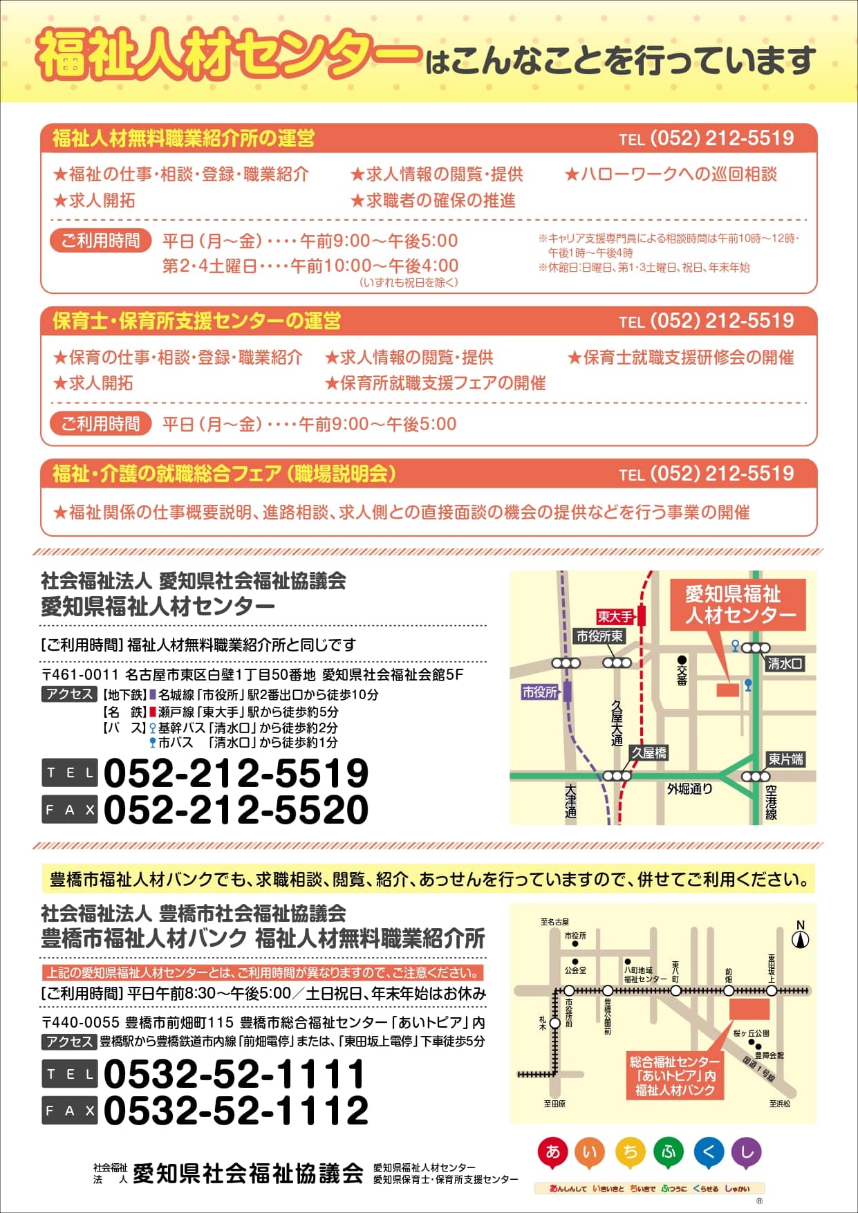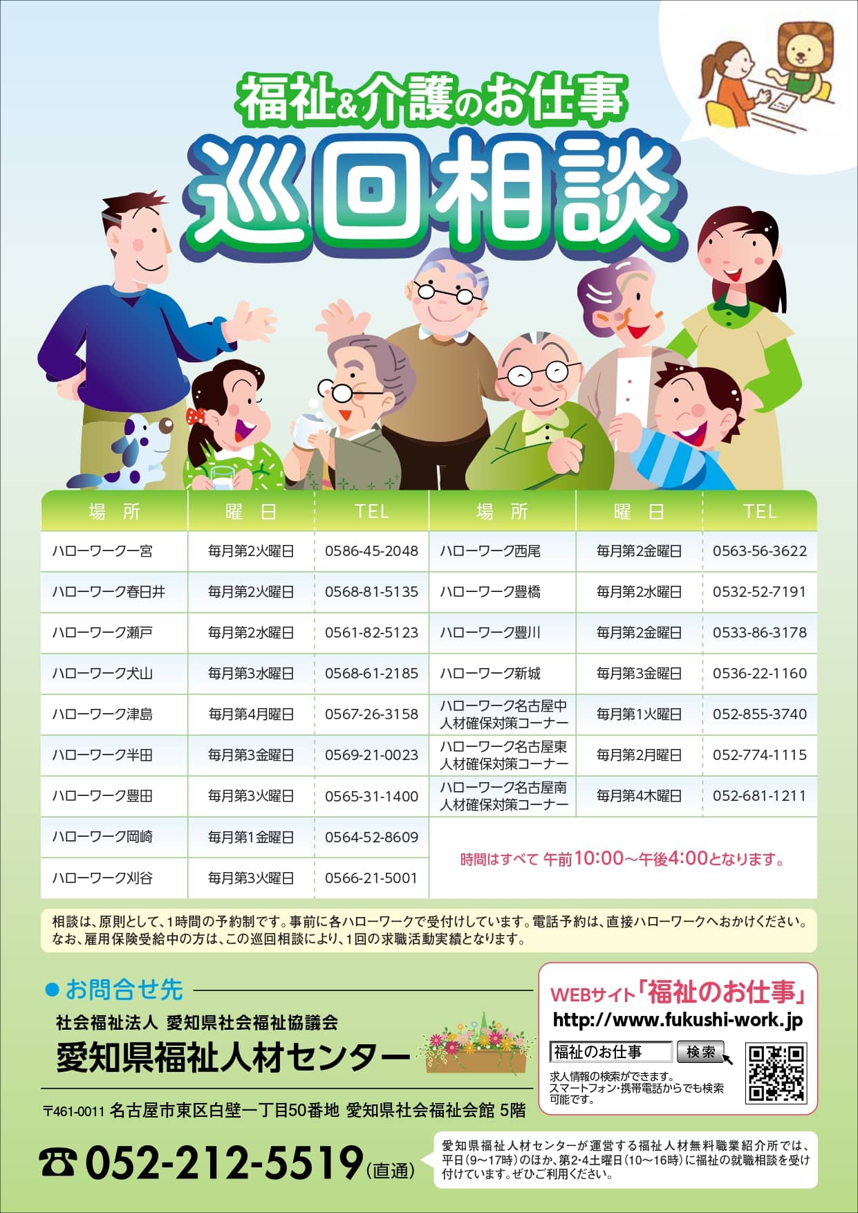 | お問い合わせ | 社会福祉法人 愛知県社会福祉協議会 愛知県福祉人材センター Tel:(052)212−5519 |
