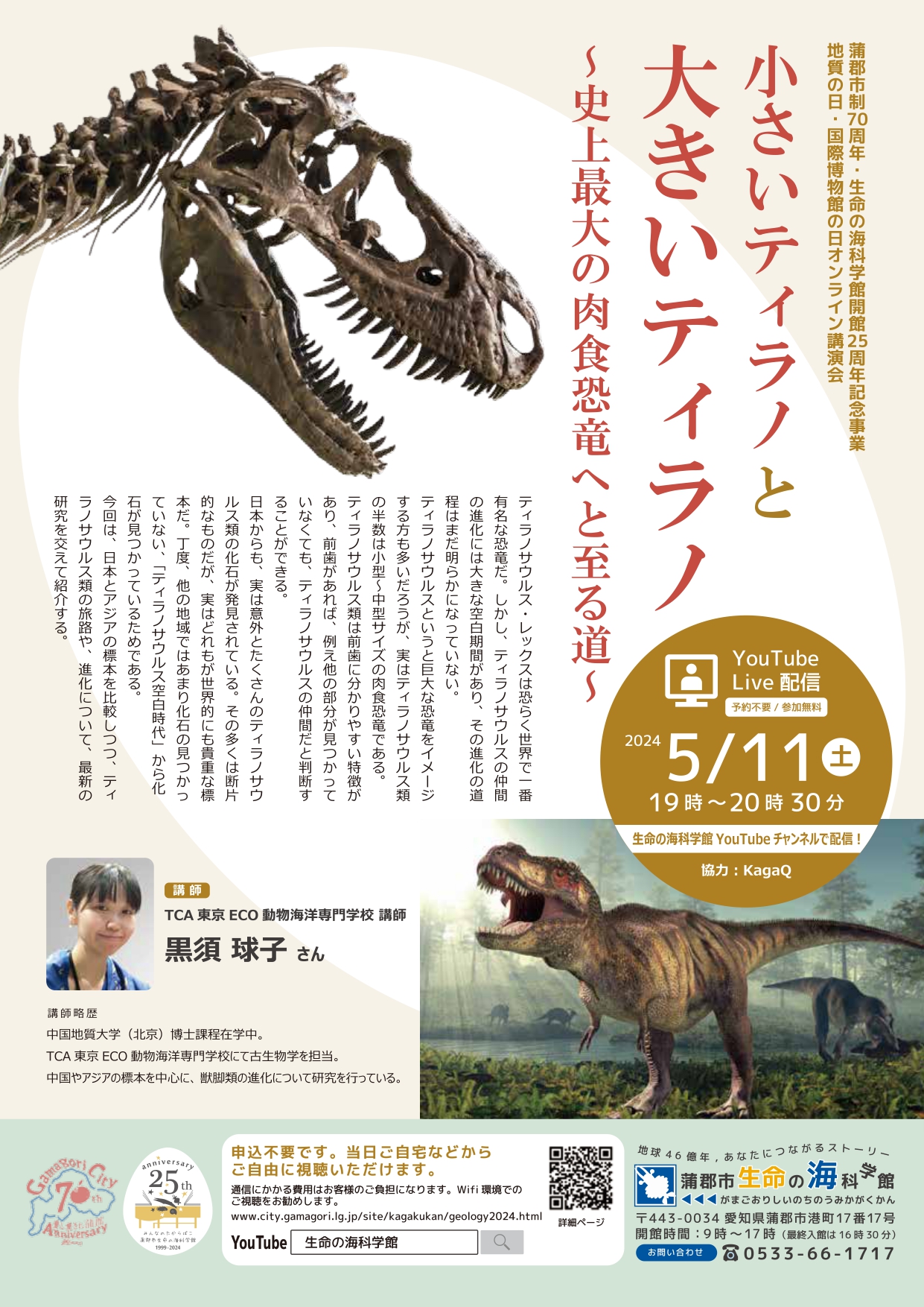 蒲郡市制70周年・生命の海科学館開館25周年を記念し、日本とアジアの標本を比較しつつ、ティラノサウルス類の旅路や、進化について、最新の研究を交えて紹介するオンライン講演会「小さいティラノと大きいティラノ 〜史上最大の肉食恐竜へと至る道〜」が開催されます。