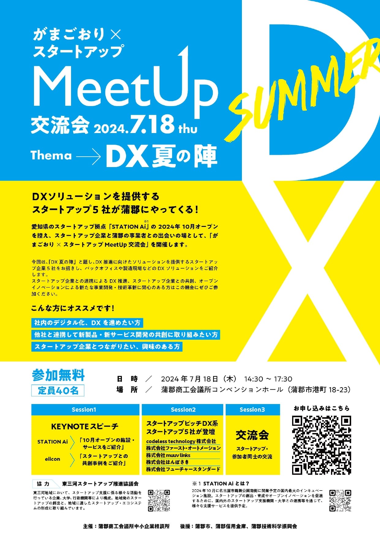 蒲郡商工会議所にて、「社内のデジタル化、DXを進めたい方」「他社と連携して新製品・新サービス開発の共創に取り組みたい方」「スタートアップ企業とつながりたい、興味のある方」などを対象に、「がまごおりxスタートアップ MeetUp 交流会」が開催されます。