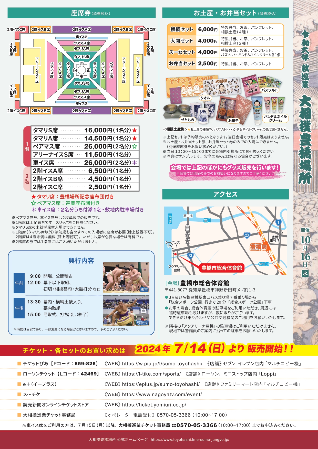 | 問合せ | 大相撲巡業チケット事務局(オペレーター対応10時から17時)
