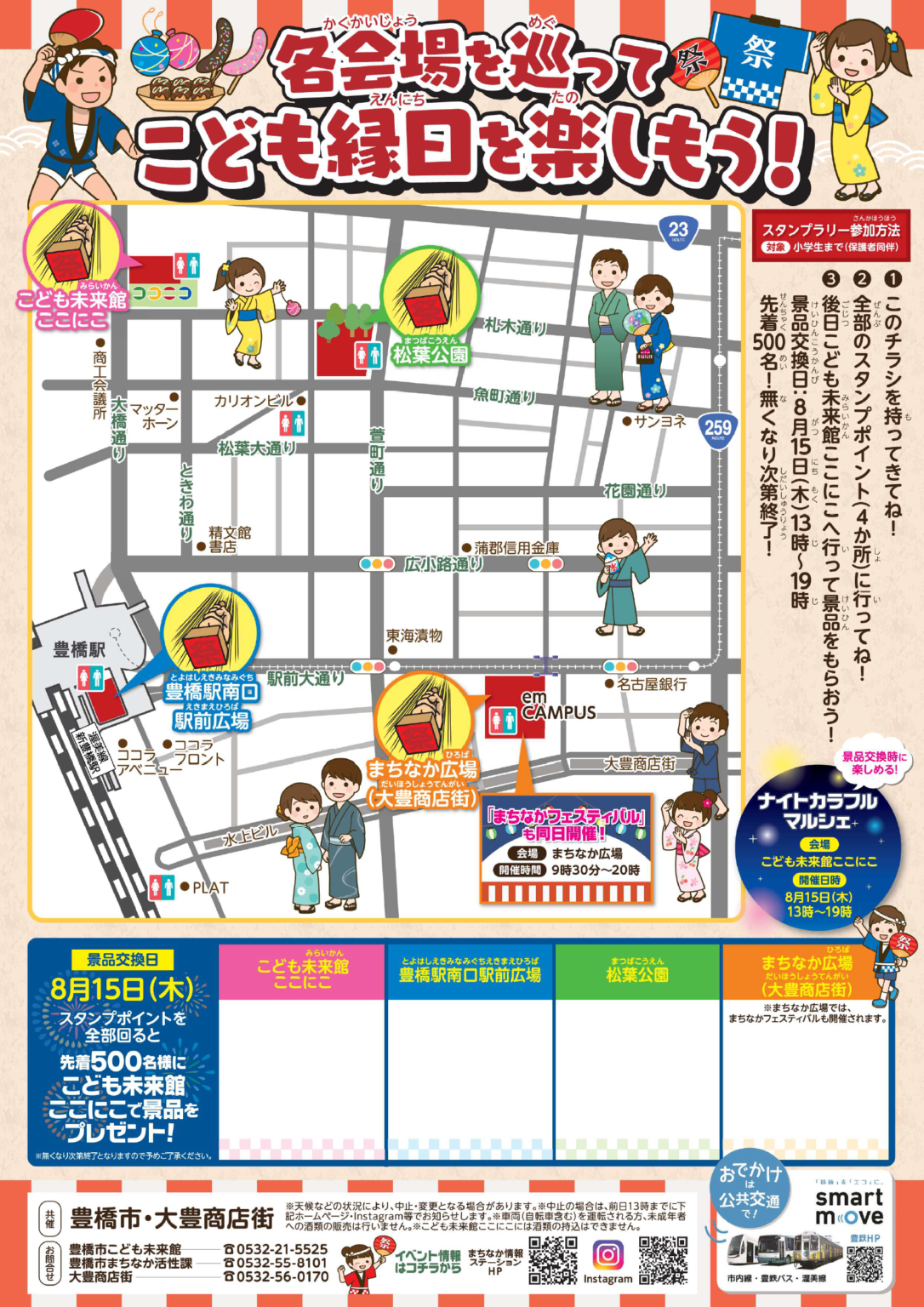 まちなか☆こども縁日を7月27日に開催します!こども未来館ここにこ、豊橋駅南口駅前広場、松葉公園、まちなか広場(大豊商店街)の各会場を巡ってこども縁日を楽しもう!