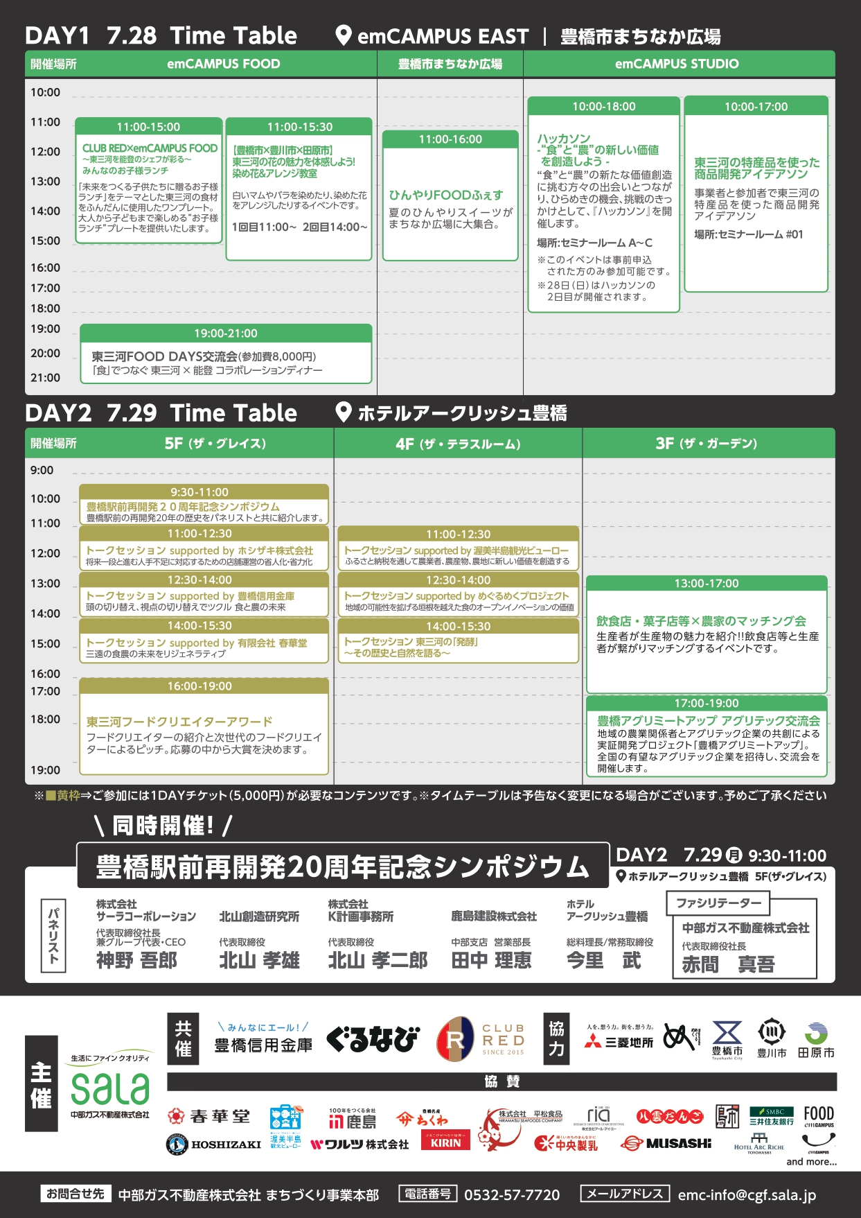 | 場所 | ■DAY1(7月28日) emCAMPUS EAST(愛知県豊橋市駅前大通二丁目81番地) 豊橋市まちなか広場(愛知県豊橋市駅前大通二丁目83番地) ■DAY2(7月29日) |