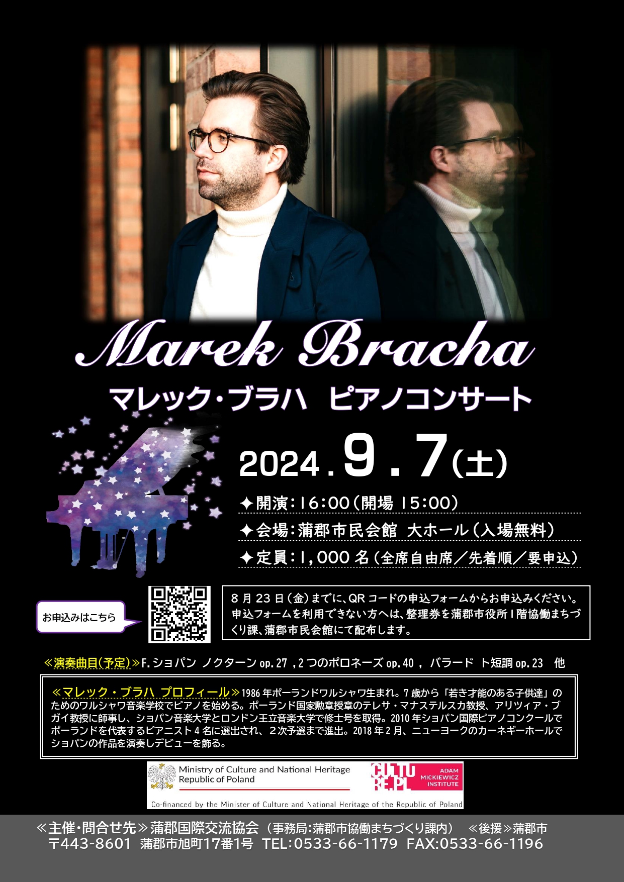 今年度は、様々な国でコンサートを実施している、ポーランド出身の実力派ピアニスト、マレック・ブラハ氏を2年ぶりにお招きします。皆さまのご来場を心からお待ちしています。