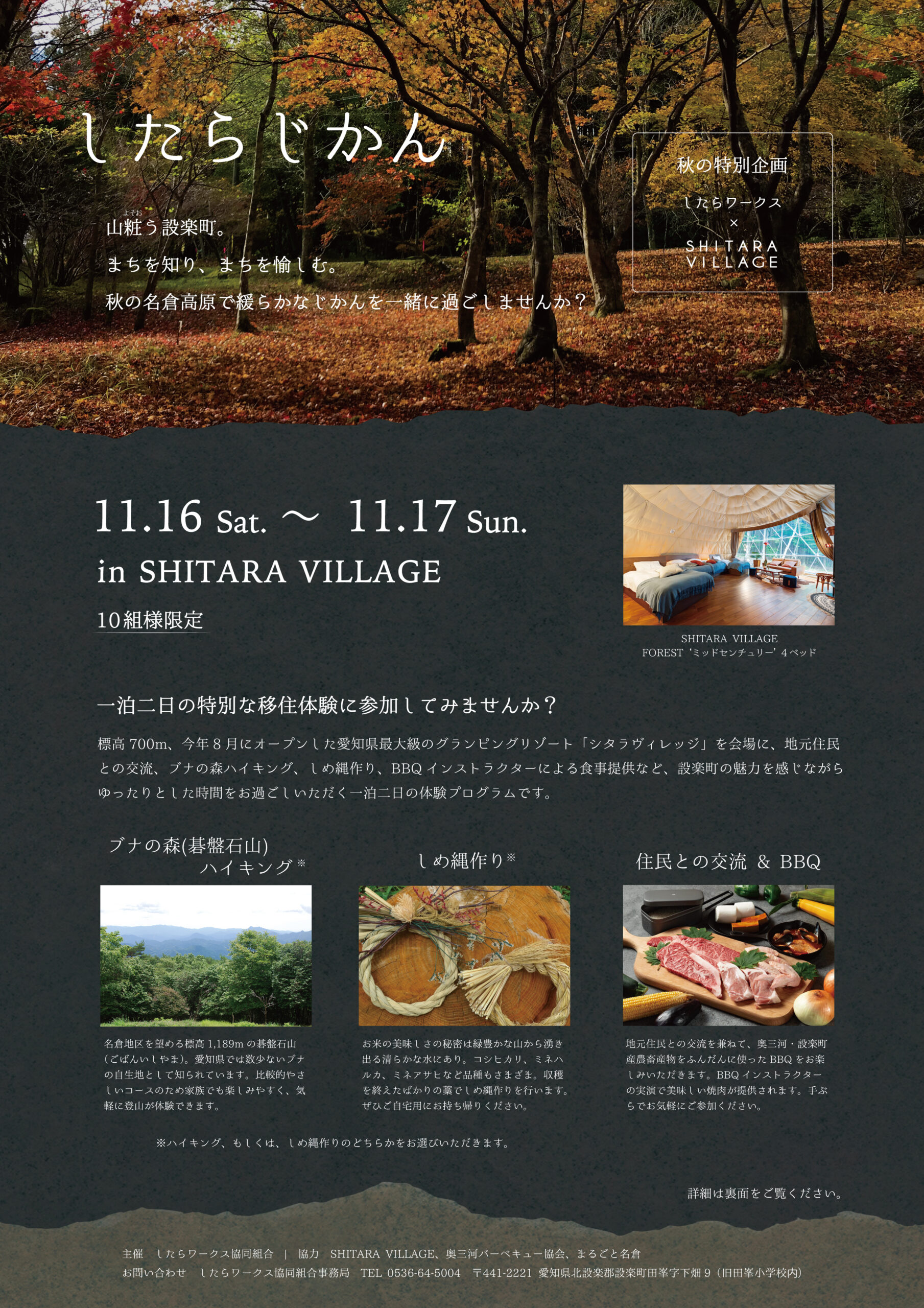 標高700m、今年8月にオープンした愛知県最大級のグランピングリゾート「シタラヴィレッジ」を会場に、地元住民との交流、ブナの森ハイキング、しめ縄作り、BBQインストラクターによる食事提供など、設楽町の魅力を感じながらゆったりとした時間をお過ごしいただく一泊二日の体験プログラムです。