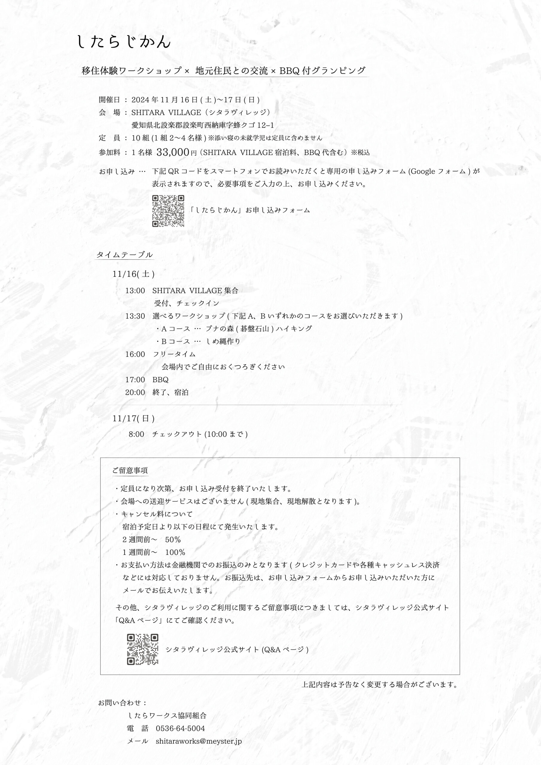 | お問い合わせ | したらワークス協同組合 TEL:0536-64-5004 MAIL:shitaraworks@meyster.jp |