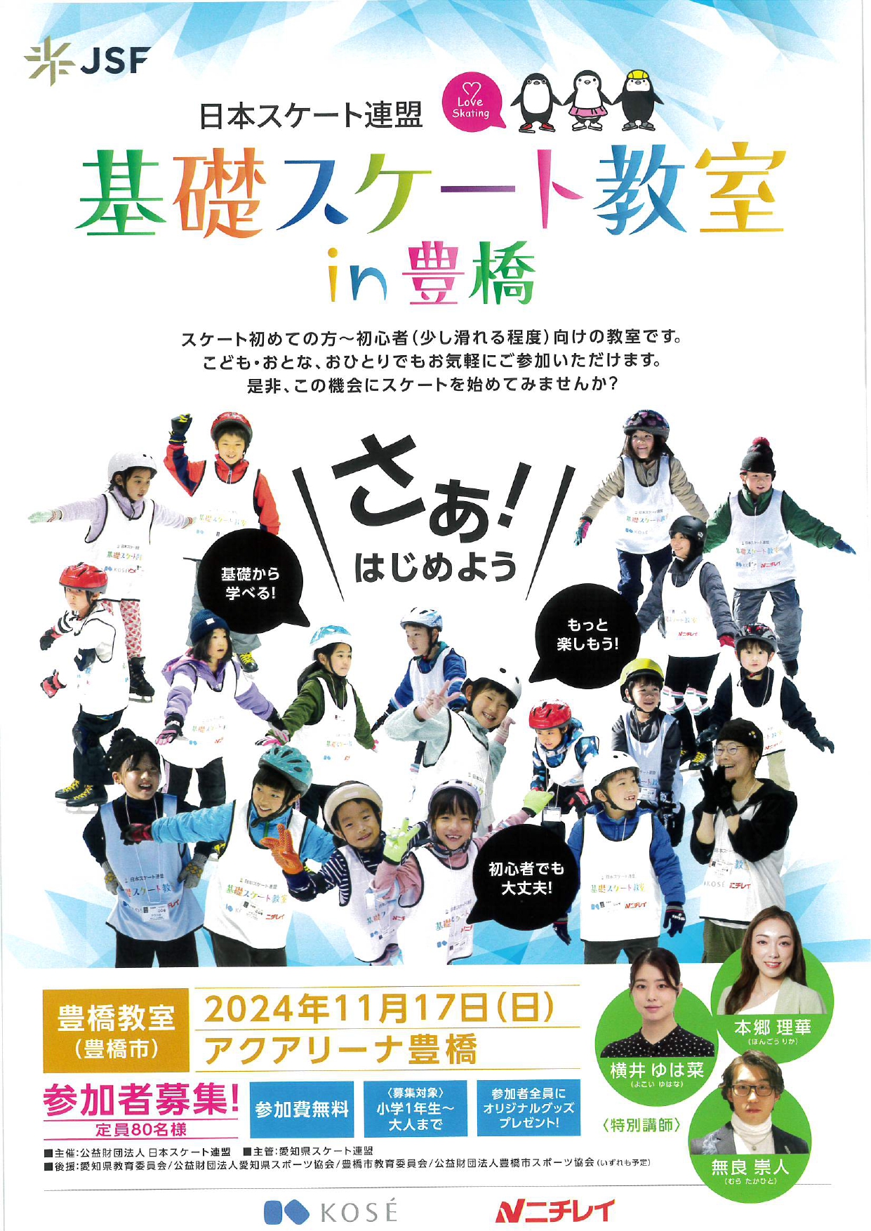 日本スケート連盟主催の「基礎スケート教室」が、愛知県スケート連盟の主管のもと、アクアリーナ豊橋で開催されます!