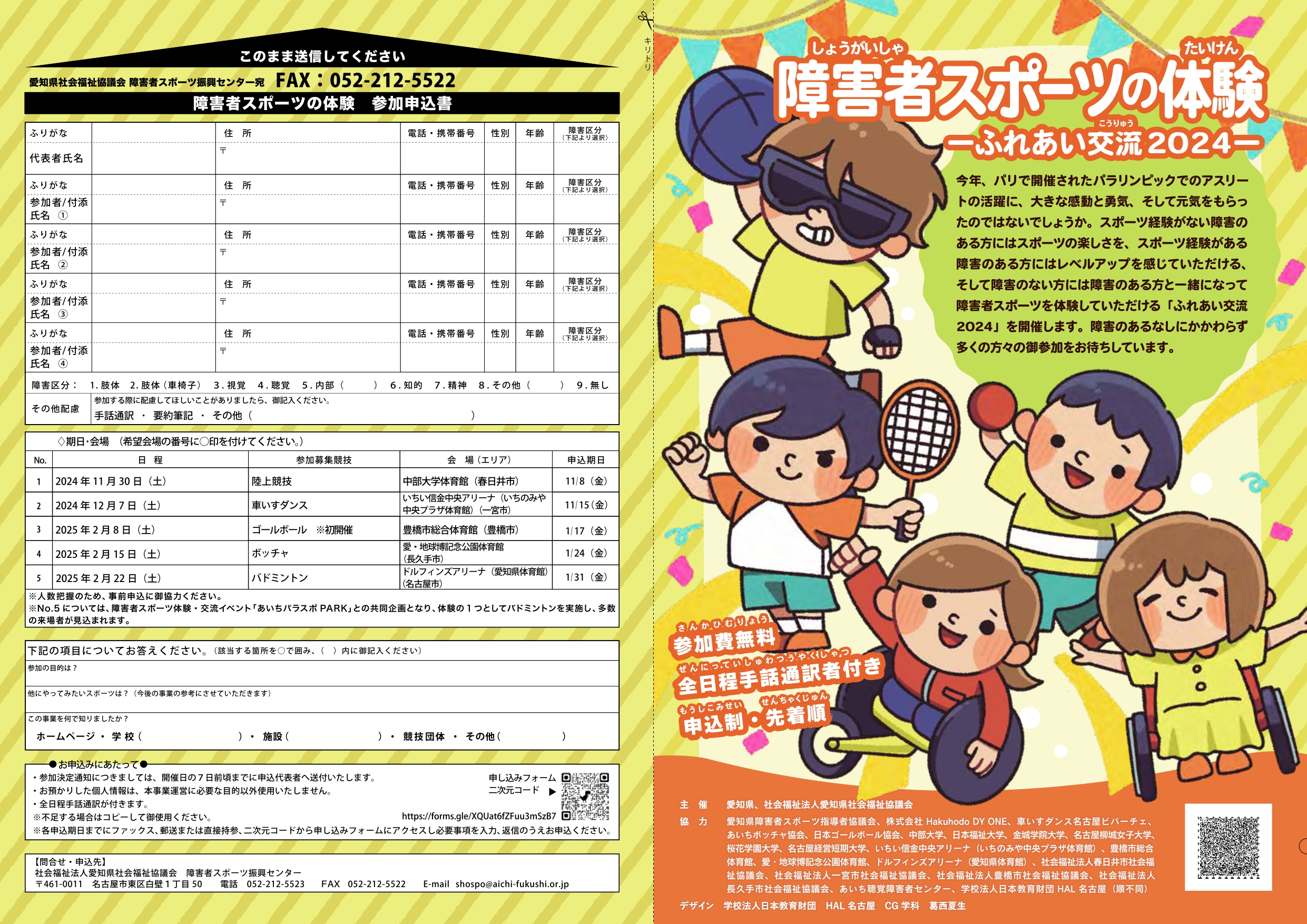 | お問い合わせ | 社会福祉法人愛知県社会福祉協議会 障害者スポーツ振興センター TEL:052-212-5523 |