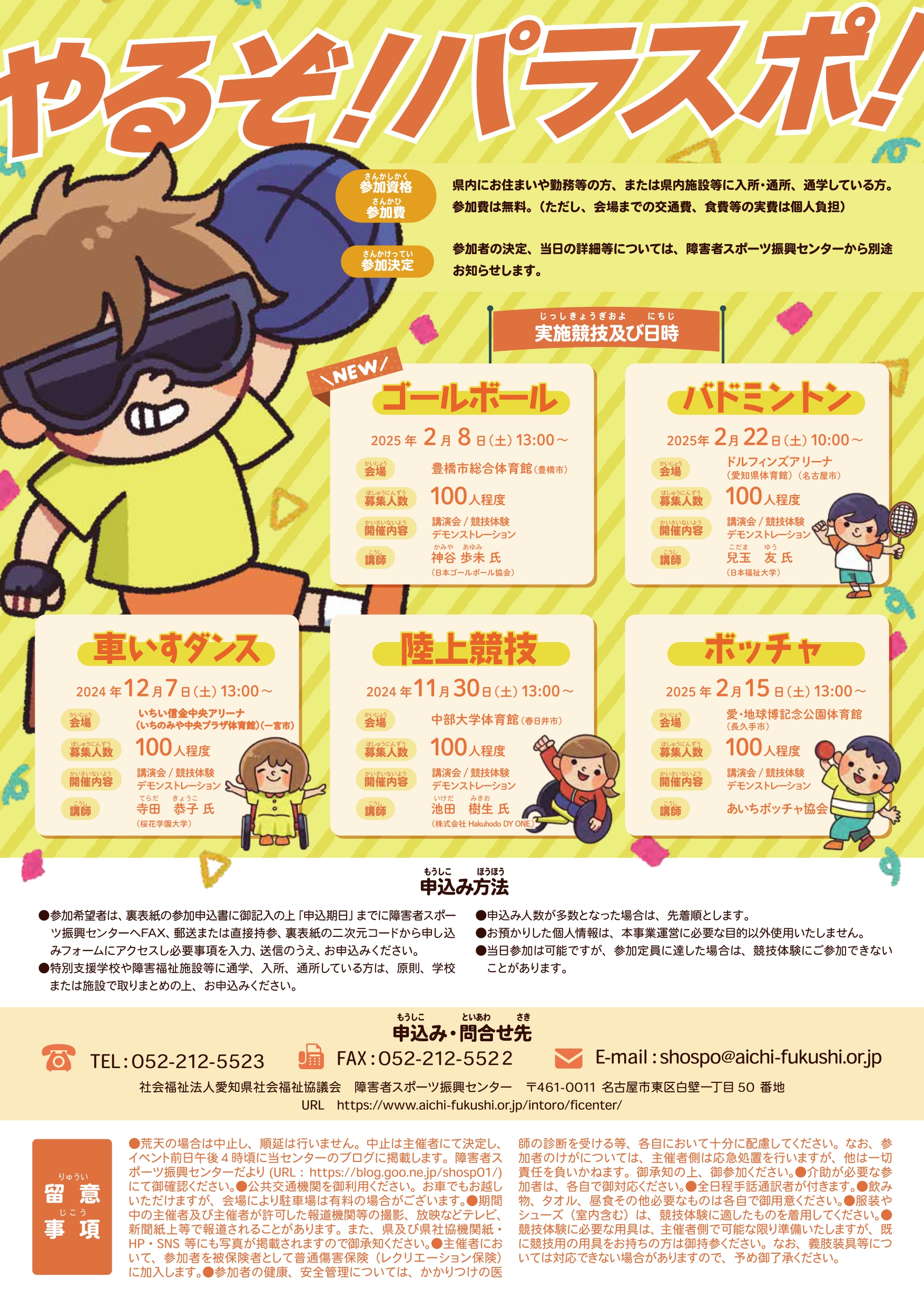 | 詳細 | 社会福祉法人愛知県社会福祉協議会 障害者スポーツ振興センターHP ※本ページは2024.12.9時点の情報になります。 |