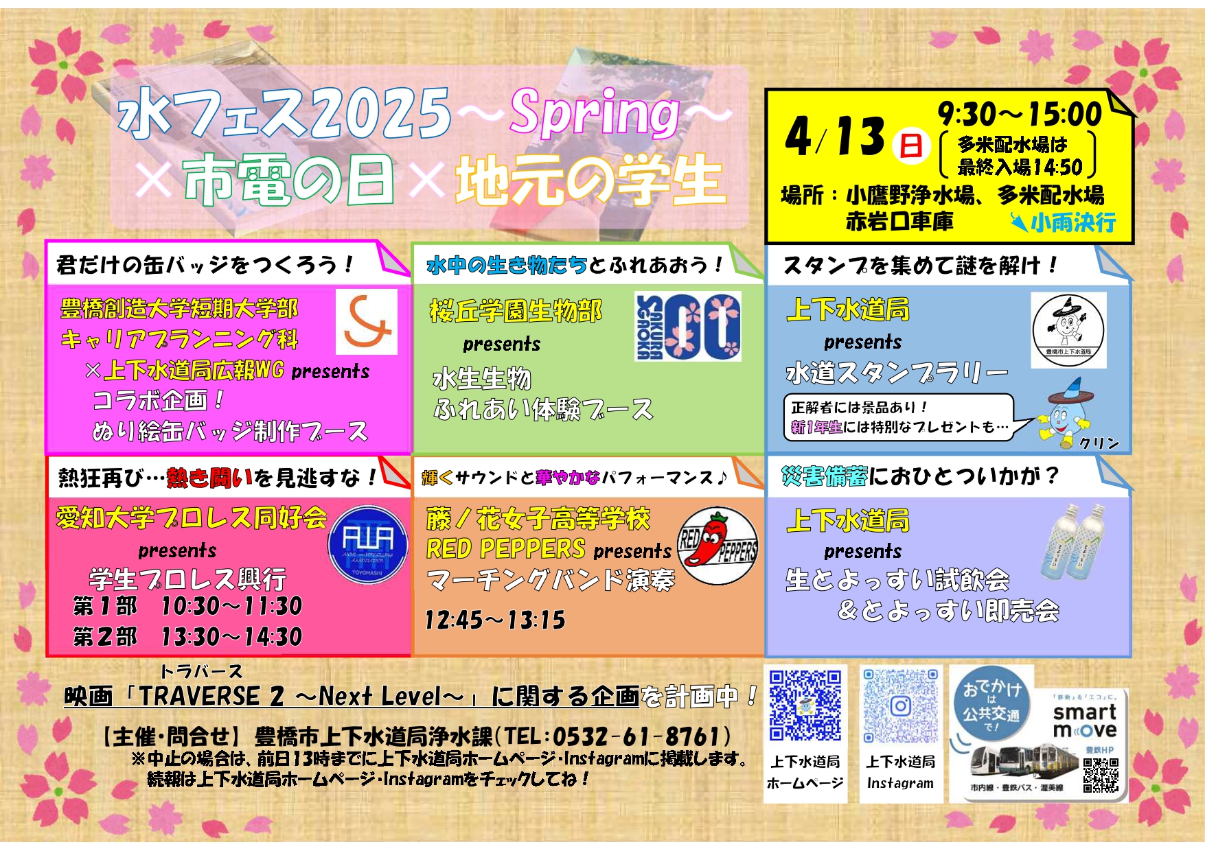 第一部では桜の咲く季節に水道施設の一般公開、第二部では豊橋鉄道株式会社・赤岩口車庫にて開催される「市電の日」イベントに合わせて、地元の高校生・大学生による多数の催し物を実施します!