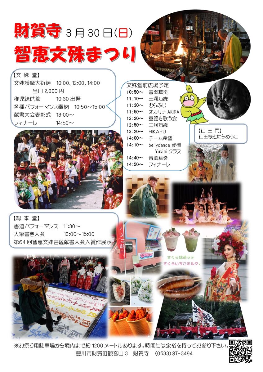 文殊護摩大祈祷、稚児練供養、書道パフォーマンス、各種奉納、大筆書き大会、仁王さま展望台、第64回智恵文殊菩薩献書大会表彰式及び作品展示など各種催し物があります。