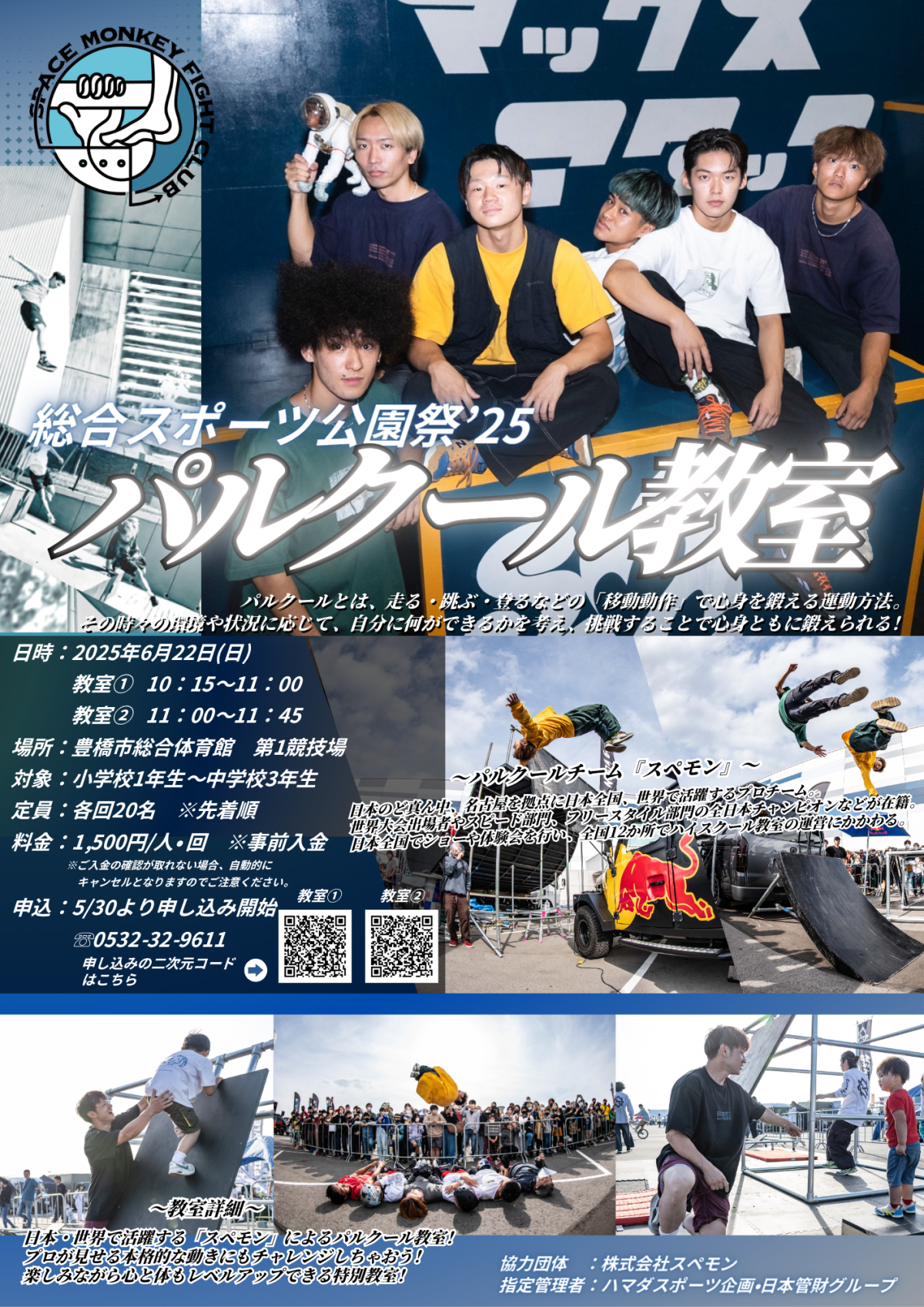 総合スポーツ公園祭はイベントが盛りだくさん!バスケットボール教室・パルクール教室・親子でチャンバラあそびの他にもトレーニングルームにてスペシャルレッスン等が開催されます。