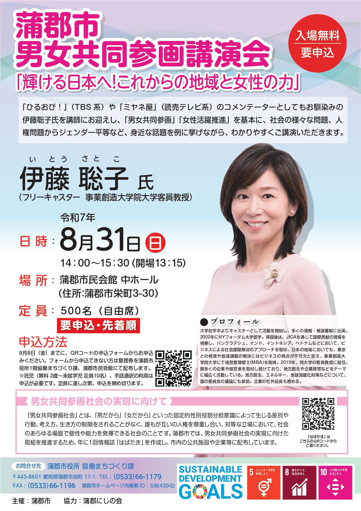 「ひるおび!」(TBS系)や「ミヤネ屋」(読売テレビ系)のコメンテーターとしてもお馴染みの伊藤聡子氏を講師にお迎えし、「男女共同参画」「女性活躍推進」を基本に、社会の様々な問題、人権問題からジェンダー平等など、身近な話題を例に挙げながら、わかりやすくご講演いただきます。