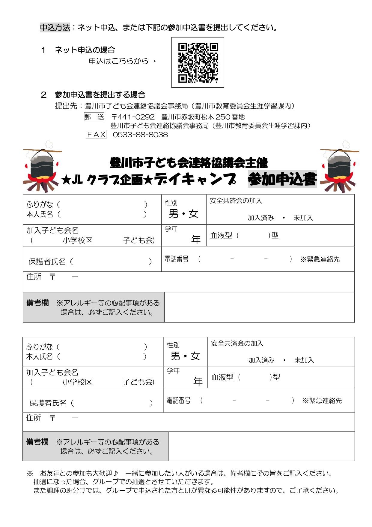 連絡先:〒441-0292 豊川市赤坂町松本250番地 豊川市子ども会連絡協議会事務局(豊川市教育委員会 生涯学習課内)