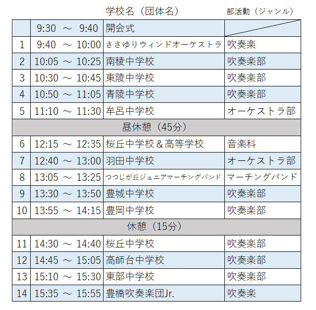 夏休みに市内の吹奏楽部、オーケストラ部、マーチングバンド等が集い、自由に互いの演奏を披露しあいます。ひたむきに音楽に取り組む姿をぜひご覧ください!