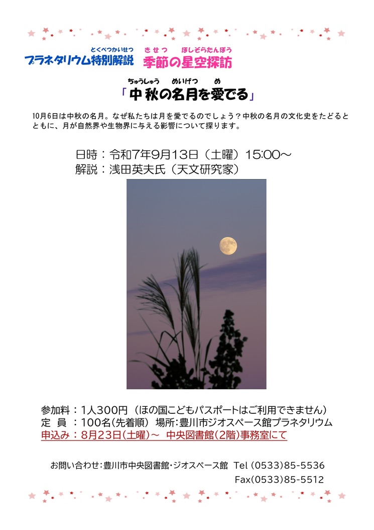 | 場所 | ジオスペース館プラネタリウム(豊川市中央図書館2階) (豊川市諏訪1丁目63) |