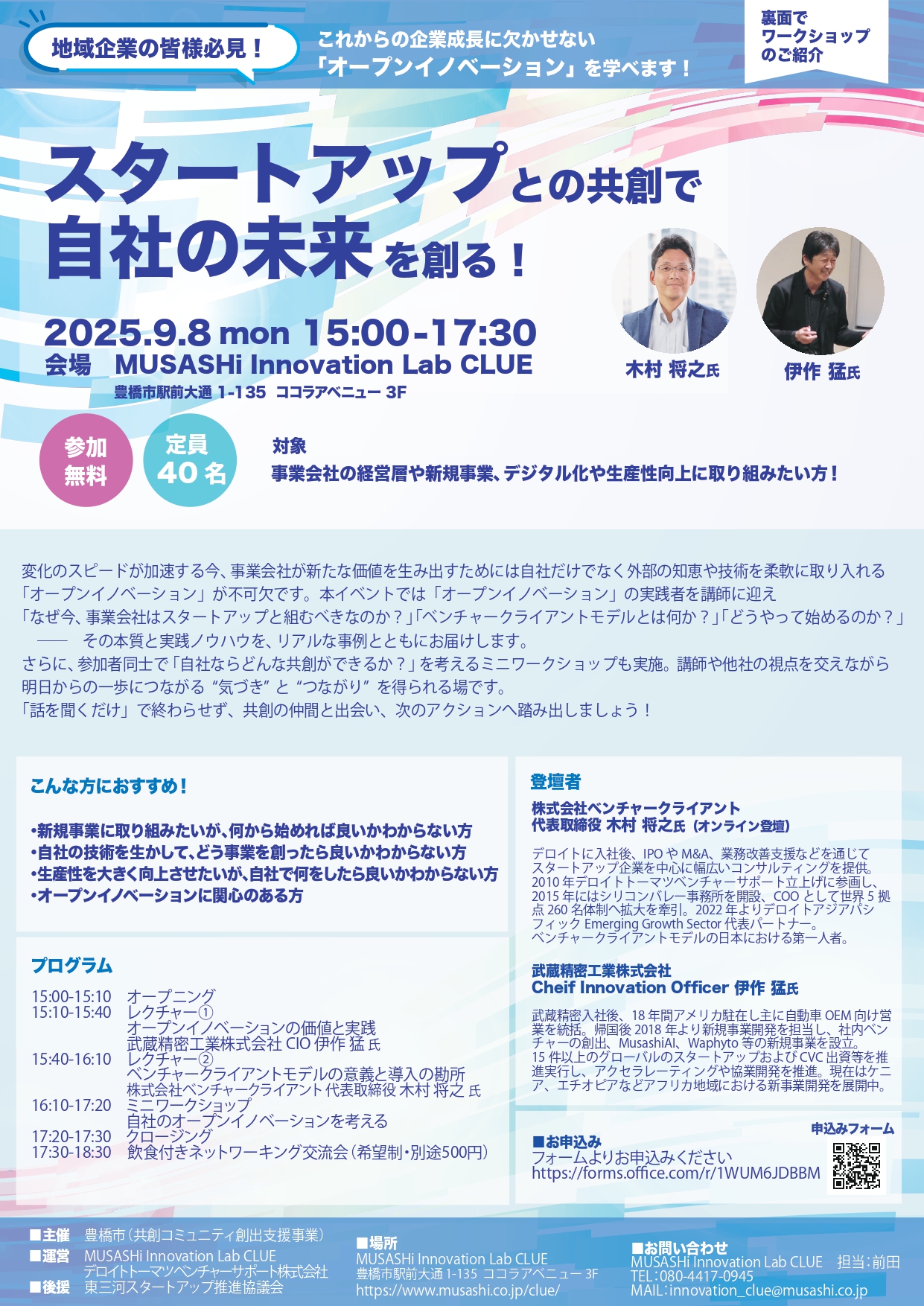 | 場所 | MUSASHi Innovation Lab CLUE 豊橋市駅前大通 1-135 ココラアベニュー 3F https://www.musashi.co.jp/clue/ |