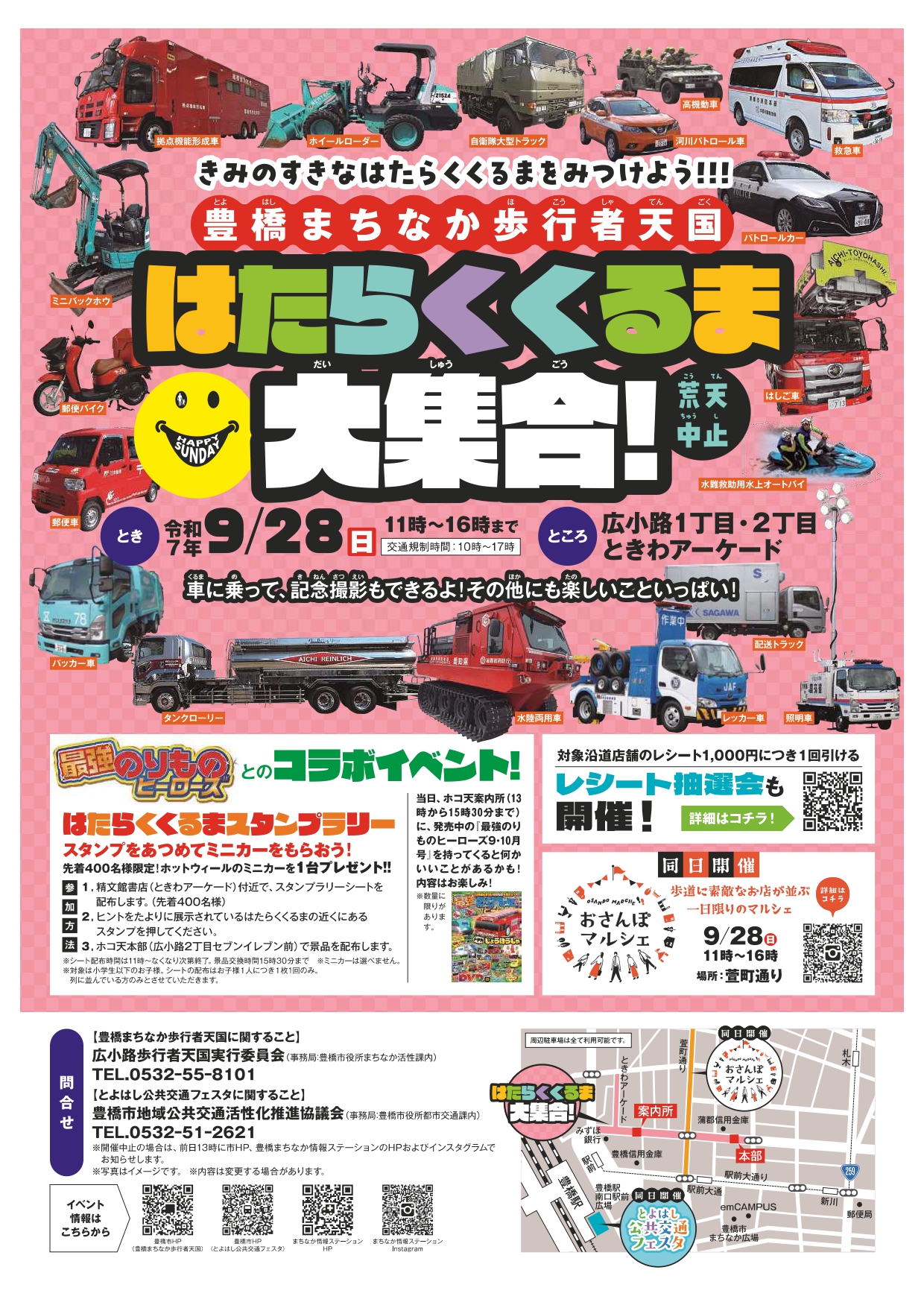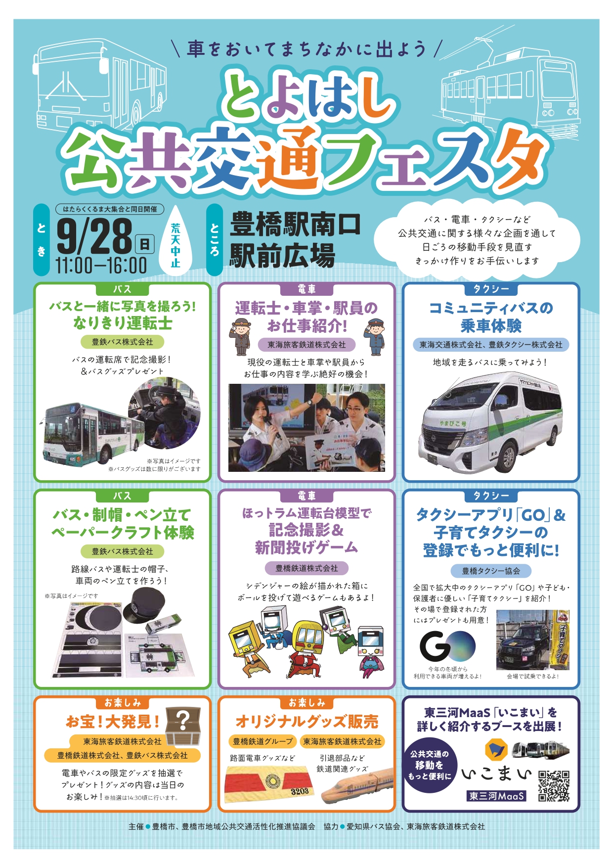 バス・鉄道・タクシーなど公共交通に関する様々な企画を通して、日ごろの移動手段を見直すきっかけ作りをお手伝いするため、「とよはし公共交通フェスタ」を開催します!同日にまちなかでは「豊橋まちなか歩行者天国」、「おさんぽマルシェ」を開催していますので、各会場を巡りながらお楽しみください!