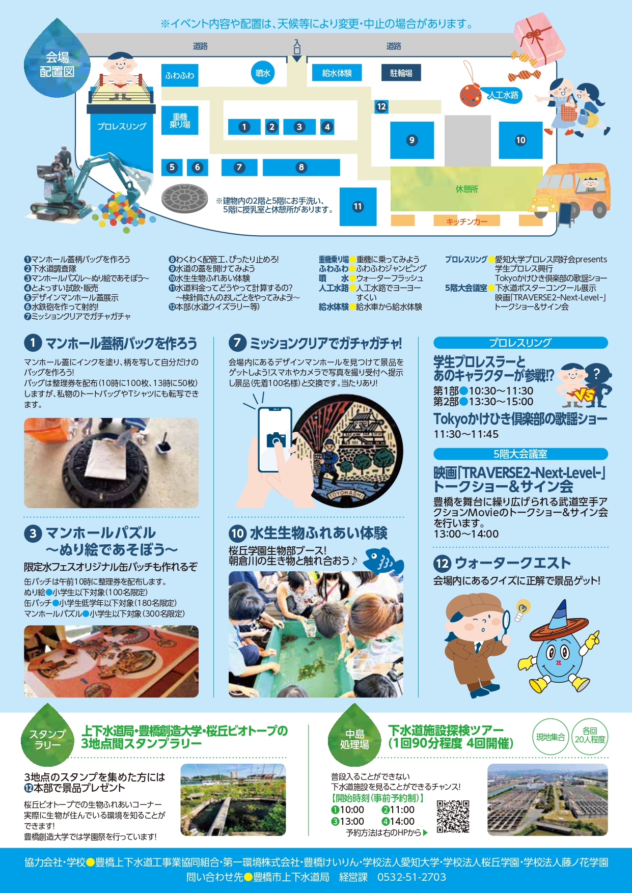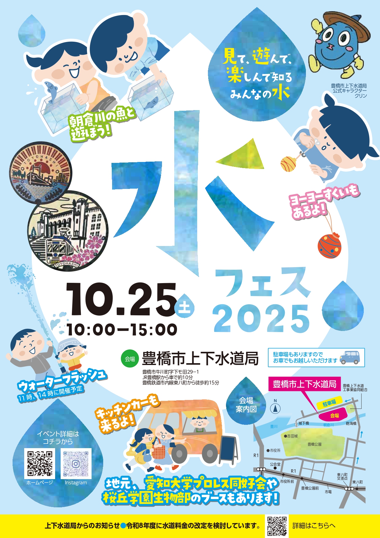 暮らしに欠かせない水道・下水道について、その役割や大切さを知ってもらい、上下水道事業を身近に感じてもらうため、市民参加型イベント『水フェス2025』を開催します。