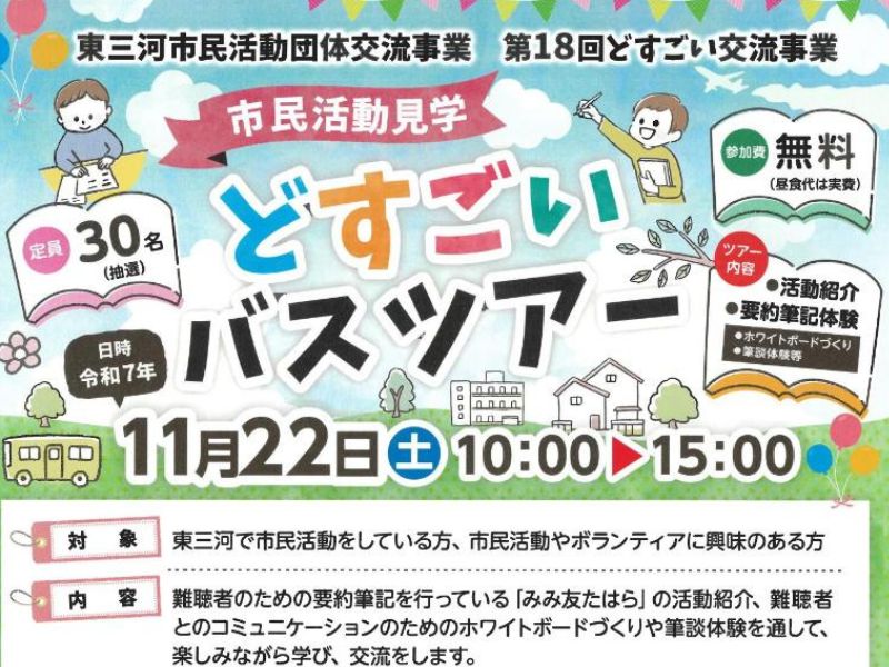 東三河で活躍する市民活動団体を実際に見て、交流するバスツアー。まだ市民活動を始めてない方の参加も大歓迎です。