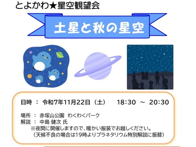 豊川市ジオスぺース館では、次のとおり、とよかわ星空観望会「土星と秋の星空」を開催します。