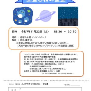 豊川市ジオスぺース館では、次のとおり、とよかわ星空観望会「土星と秋の星空」を開催します。