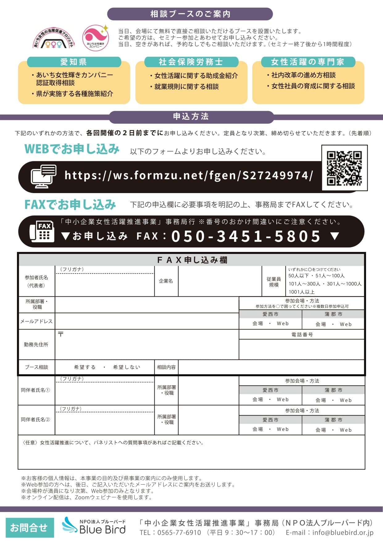 | お問い合わせ | 「中小企業女性活躍推進事業」事務局(NPO法人ブルーバード内) TEL:0565-77-6910(平日9:30〜17:00) |