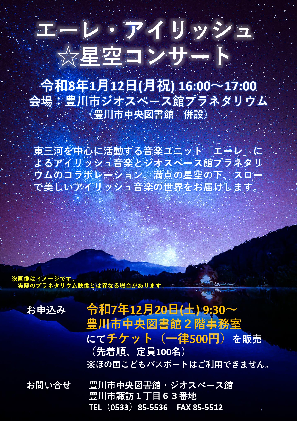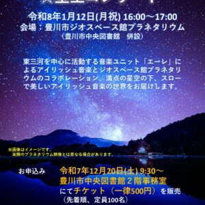 豊川市ジオスペース館では、次のとおり「エーレ・アイリッシュ☆星空コンサート」を開催します。