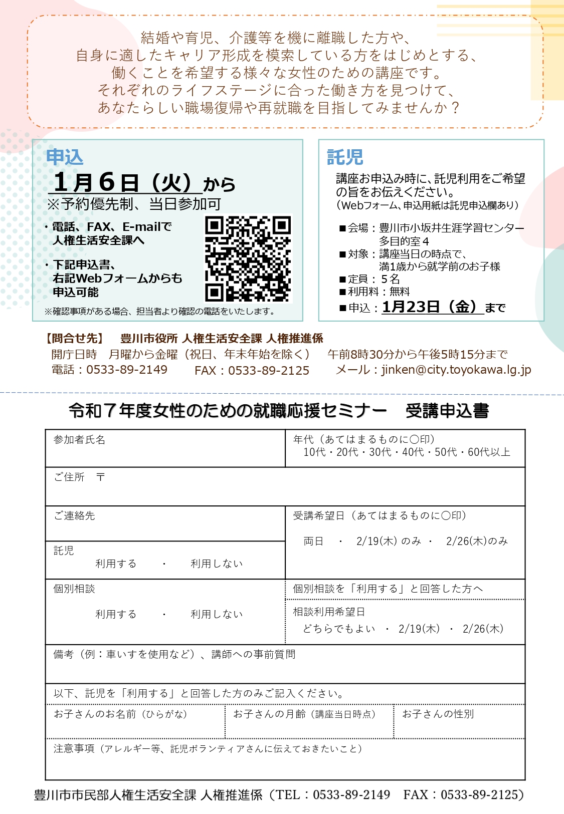 2026年1月6日(火)より、Webフォーム(外部リンク)、電話(89-2149)、チラシ裏面の申込用紙を窓口・ファックス(89-2125)・E-mail(jinken@city.toyokawa.lg.jp)で先着順に受付。