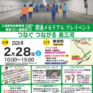 三遠南信自動車道(佐久間道路・三遠道路)東栄ICから鳳来峡IC区間の開通を記念し、メモリアルプレイベントを開催します。