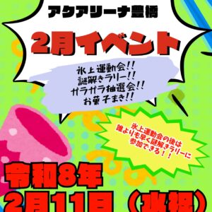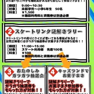 | 日時 | 令和8年2月11日(水・祝) ➀氷上運動会 9:00~10:30 ➁スケートリンク謎解きラリー 11:00~15:00 ガチャガチャ抽選会 11:00~16:00 お菓子まき 13:00スタート |