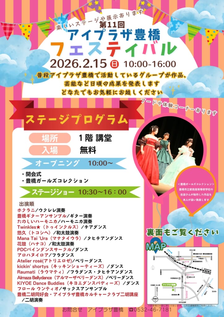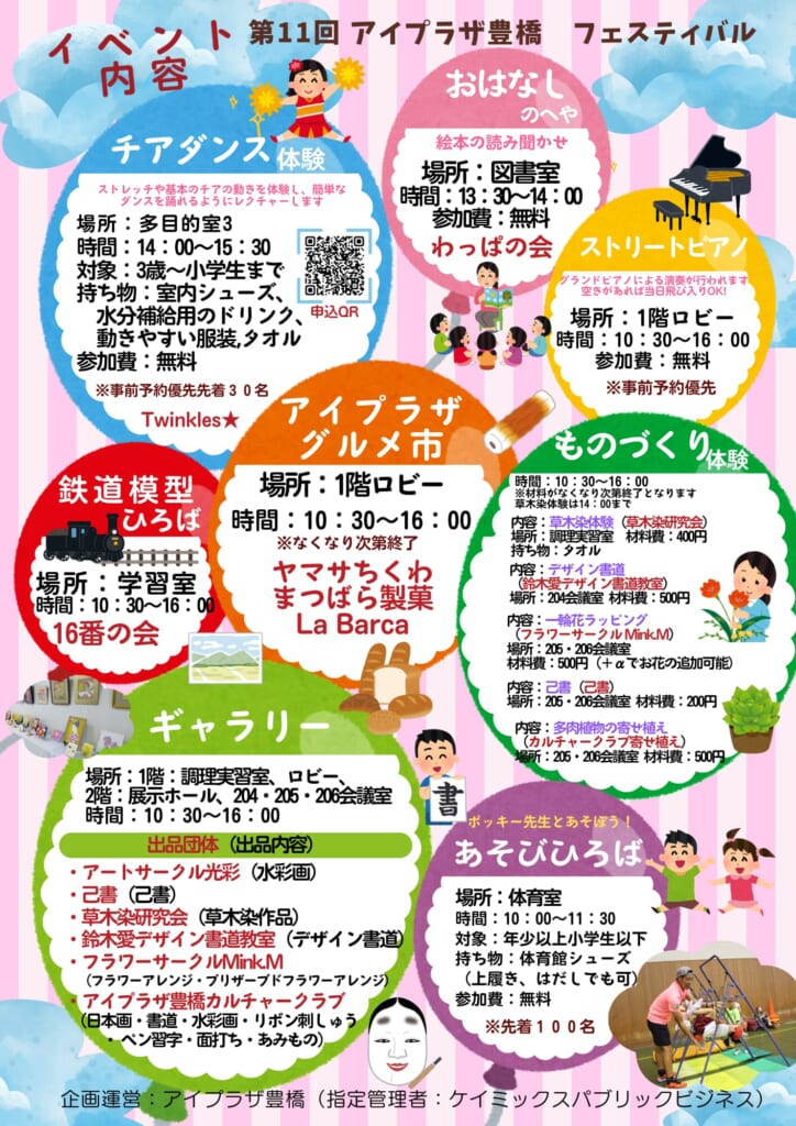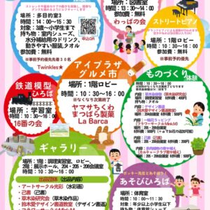 アイプラザ豊橋利用者によるステージショーやアイプラザグルメ市、鉄道模型の展示、豊橋市立家政高等専修学校によるファッションショー、ものづくり体験、ギャラリー、あそびひろば、絵本の読み聞かせなど楽しいイベントが盛りだくさんです!