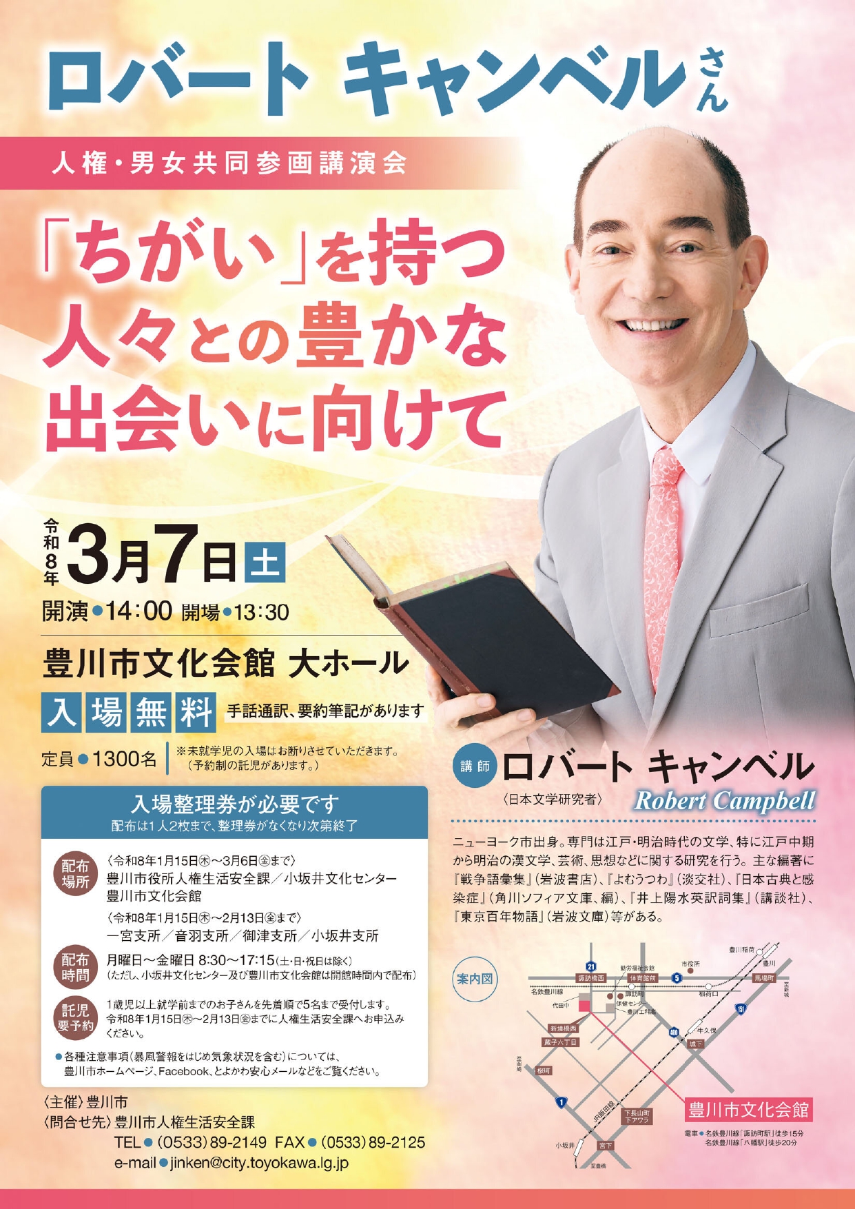 豊川市では、人権尊重思想の普及・高揚と男女共同参画への理解を深めることを目的として、人権・男女共同参画講演会を開催します。