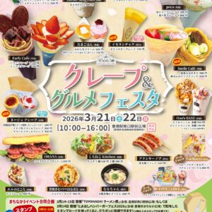 2月14日・15日開催の「TOYOHASHIラーメン祭」もしくは、3月14日開催の「とよはしハンバーガーフェス2026」で配布したスタンプカードに2個以上のスタンプを集めたら、ガラポンに挑戦できます!スタンプは本イベント「クレープ&グルメ フェスタ」でも集められます!あたりが出たら、ステキな景品をプレゼントします!(各日先着150名)