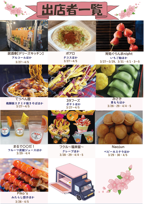 3月27日(金)から4月5日(日)の11:00〜20:30分までさまざまなキッチンカーが出店します。
