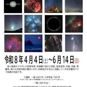 星と風景が織りなす星景写真、望遠鏡で捉えた惑星、星雲星団、日食、月食、彗星等、様々な天体写真を展示します。