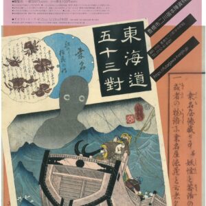 浮世絵《 東海道五十三対(とうかいどうごじゅうさんつい)》は、幕末の歌川派を代表する3人の絵師、三代豊国・広重・国芳が分担して描いた東海道揃(そろいもの)のひとつです。しかし、本作の主題は東海道の風景ではありません。和歌・俳句や、伊勢物語・平家物語・膝栗毛など新旧の文学作品、各地の伝説から能・浄瑠璃・歌舞伎といった芸能に至るまで、連綿と続いてきた東海道という地域・街道にまつわる文化的な積み重ねを再利用して各宿を紹介するものでした。本展では、《東海道五十三対》26 点と、その画題の源泉となった書籍などをあわせて展示いたします。